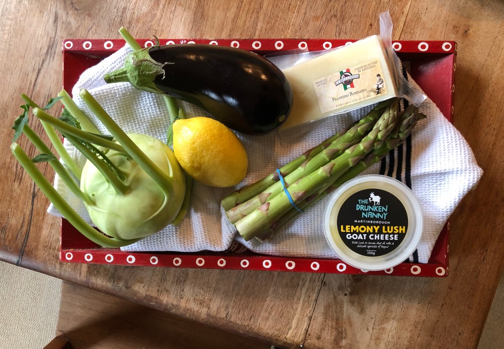 Of course, no TWSP post would be complete without some mention of food. I had a lovely Dahl Makhani with kidney beans and coconut at Arranged Marriage in New Plymouth, an avocado toast on Saturday at Squirrel, and of course, Thursday’s wonderful meal at Field & Green that you can read about here. On Saturday I picked up some aubergines (eggplants) to make moussaka, asparagus because it is the season, and another kohlrabi. There was lemony goat cheese to slather on bread, and pecorino to go in the sauce on top of the moussaka, and of course, bread from Arobake, delivered fresh on Saturday morning.