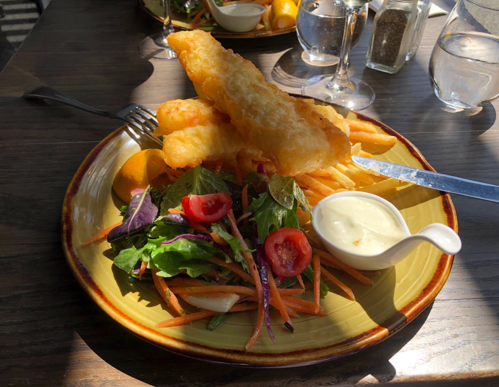 Just to add further delays, it took ages to pick up the hire car, so by the time we got to the hotel, we were ravenously hungry. We popped along to a nearby cafe for some fish and chips and a glass of wine. It was much needed!