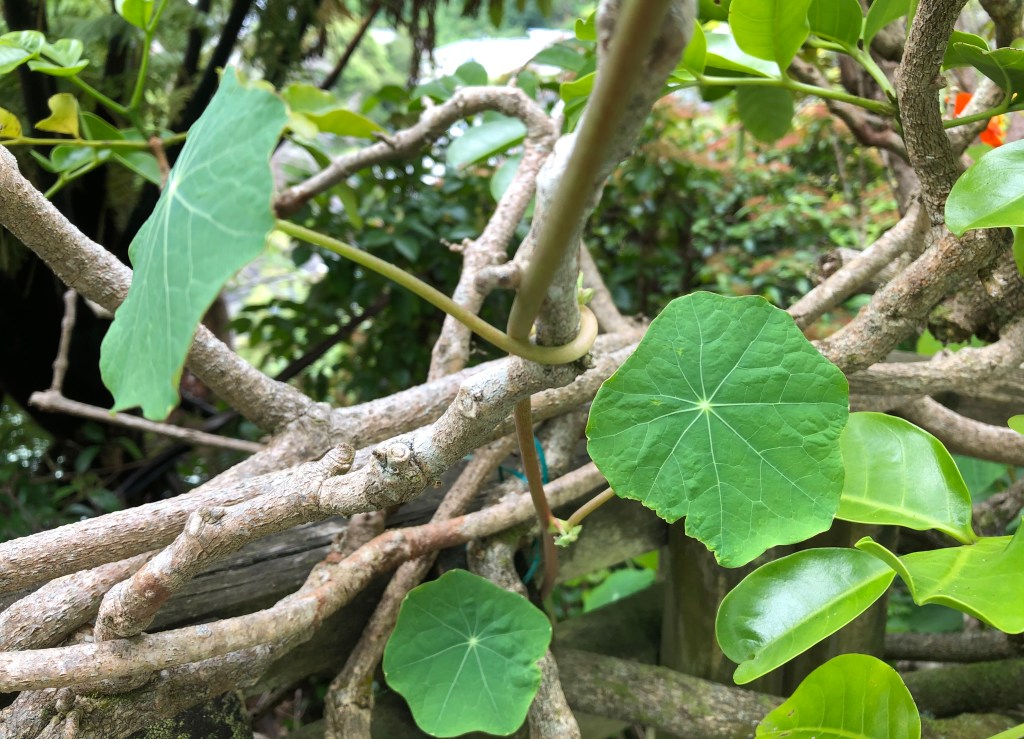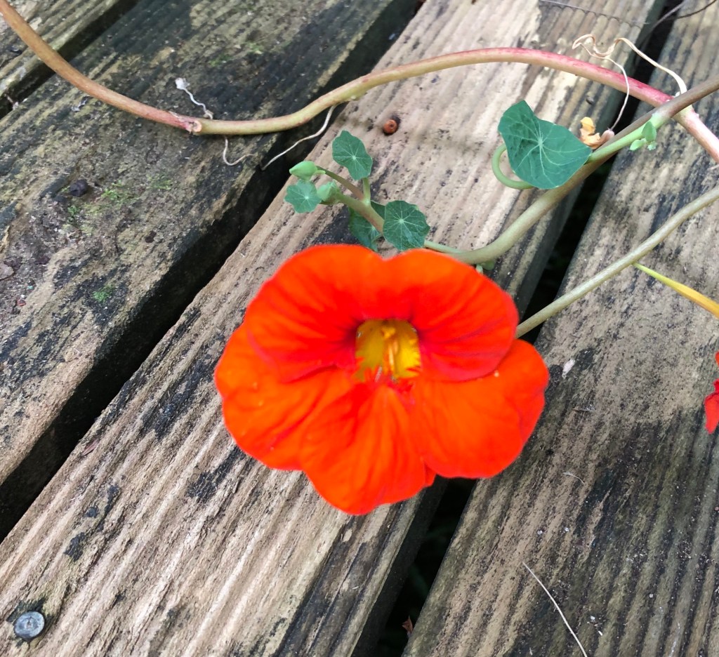 I was sitting at my computer, wondering what to include in this blog post, when I noticed nasturtium leaves where I wasn’t expecting them, twisted around the tecomanthe speciosa. On closer inspection, I could see a large plant that has sprung up (from seeds blown from other plants?), and is flowering and even spreading over the decking. I have no idea why I hadn’t noticed this before, but there we are. Oh and one final note on nasturtiums – some little leaves were used as garnish on the lamb dish I ate on Thursday when we were out.