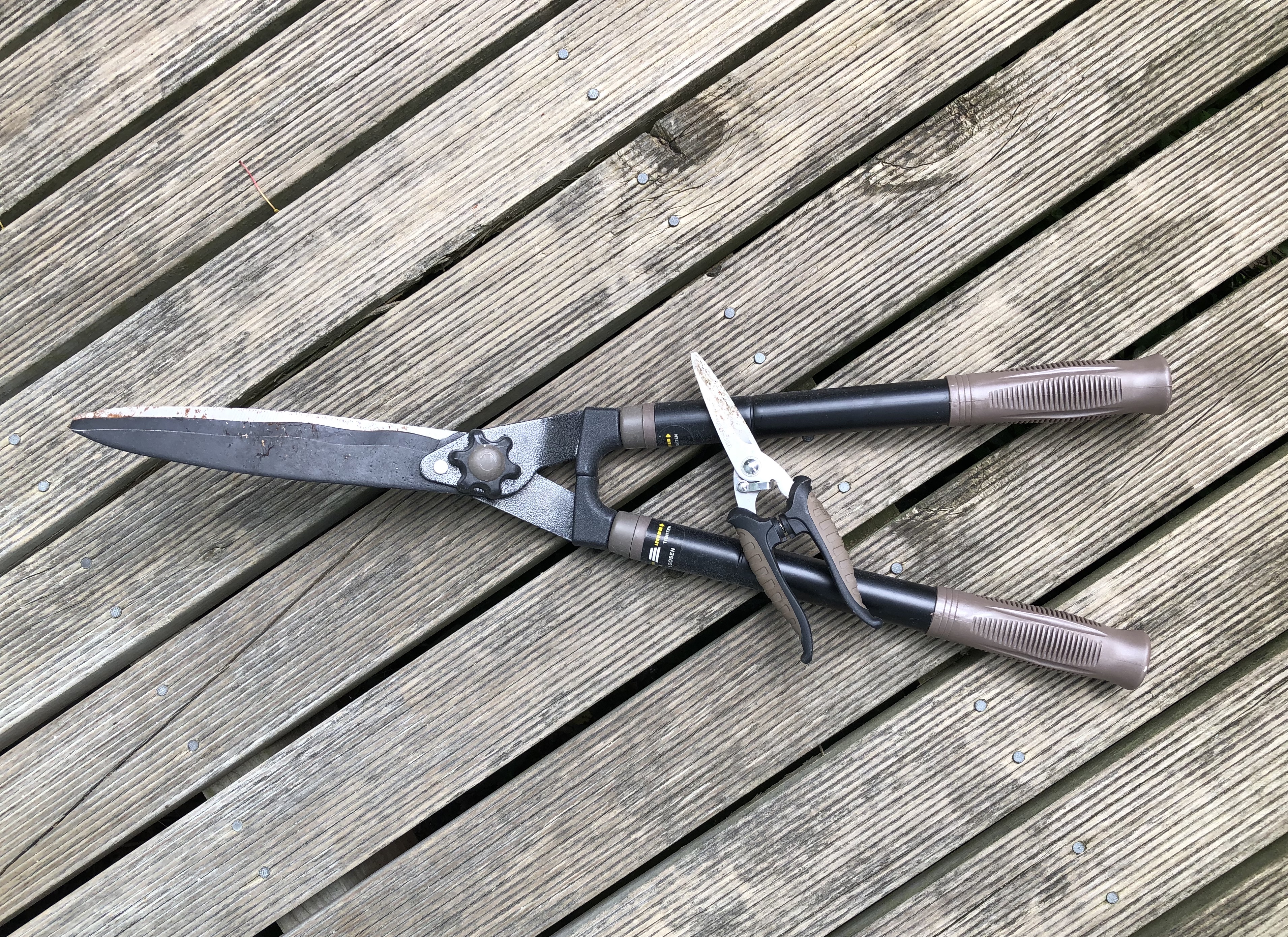 With all this growing going on, the two most useful tools just now are these. Branches are overhanging places we don’t want them to overhang, things are getting straggly or growing over one set of steps (there are three outside the house….).