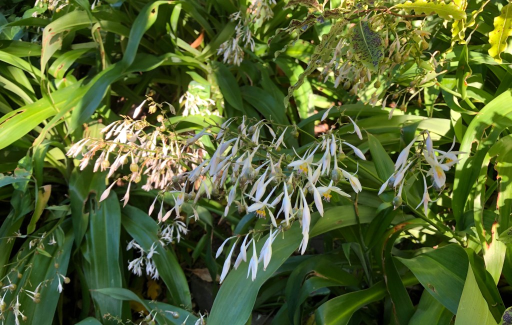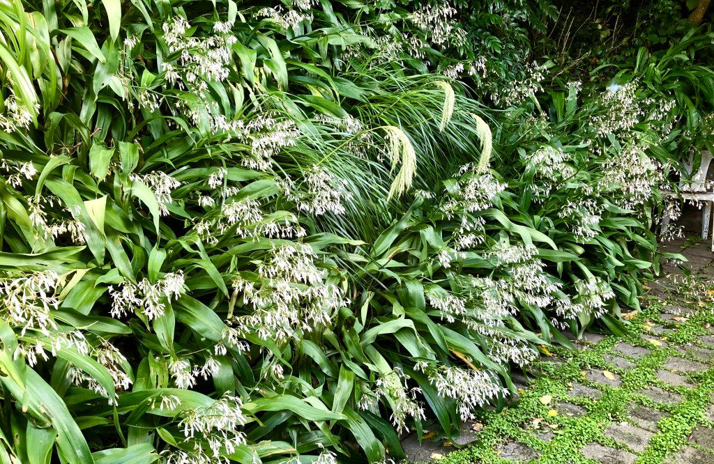 I was in two minds about showing you what it is like at the back of the house at the moment, but here we go at number three, a sea of white and green (yes that is an old garden chair covered with leaves). It does look like a lot of arthropodium cirratum (or New Zealand rock lily or rengarenga). What you can’t really see from the picture is that the plants are sitting on a slope, and in the shade, so is ideal coverage for this spot.