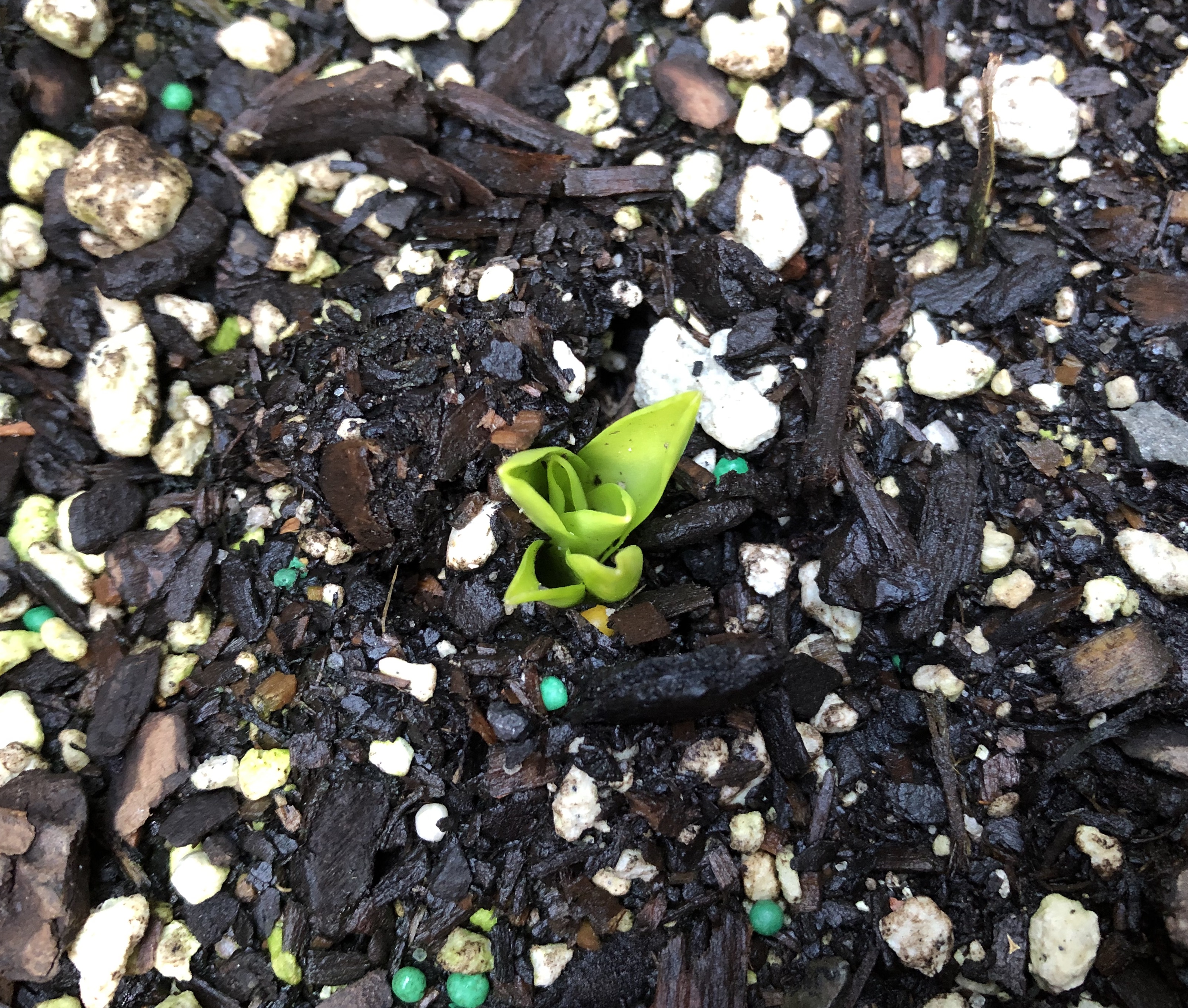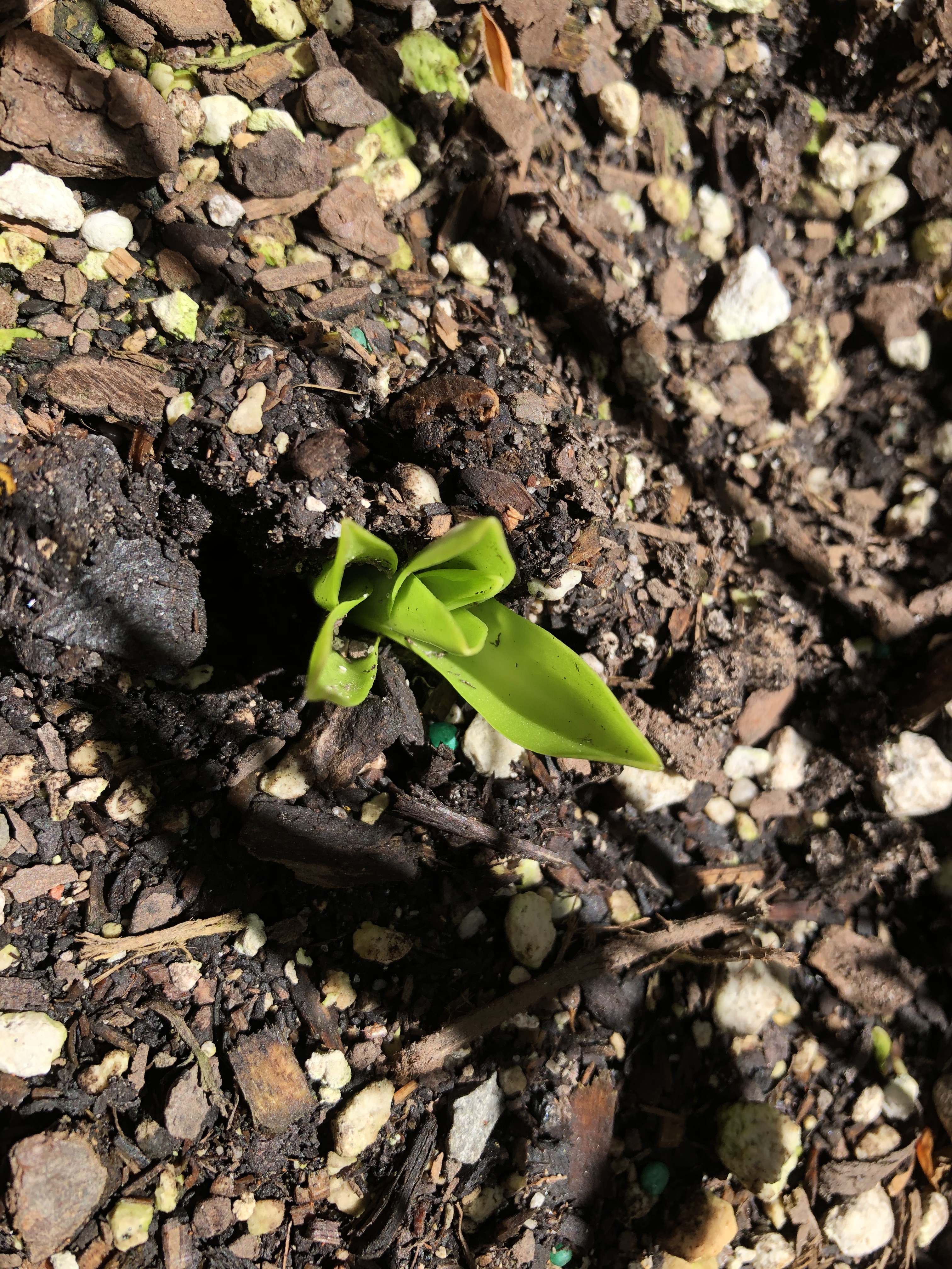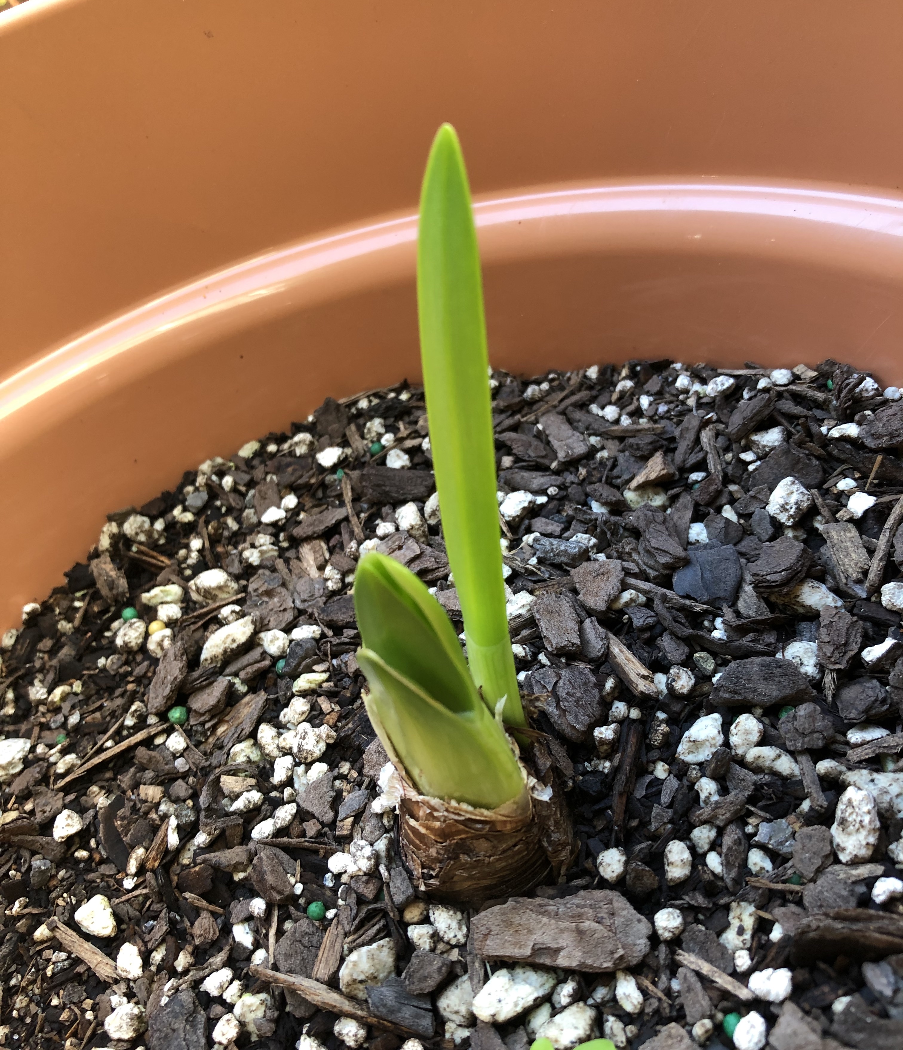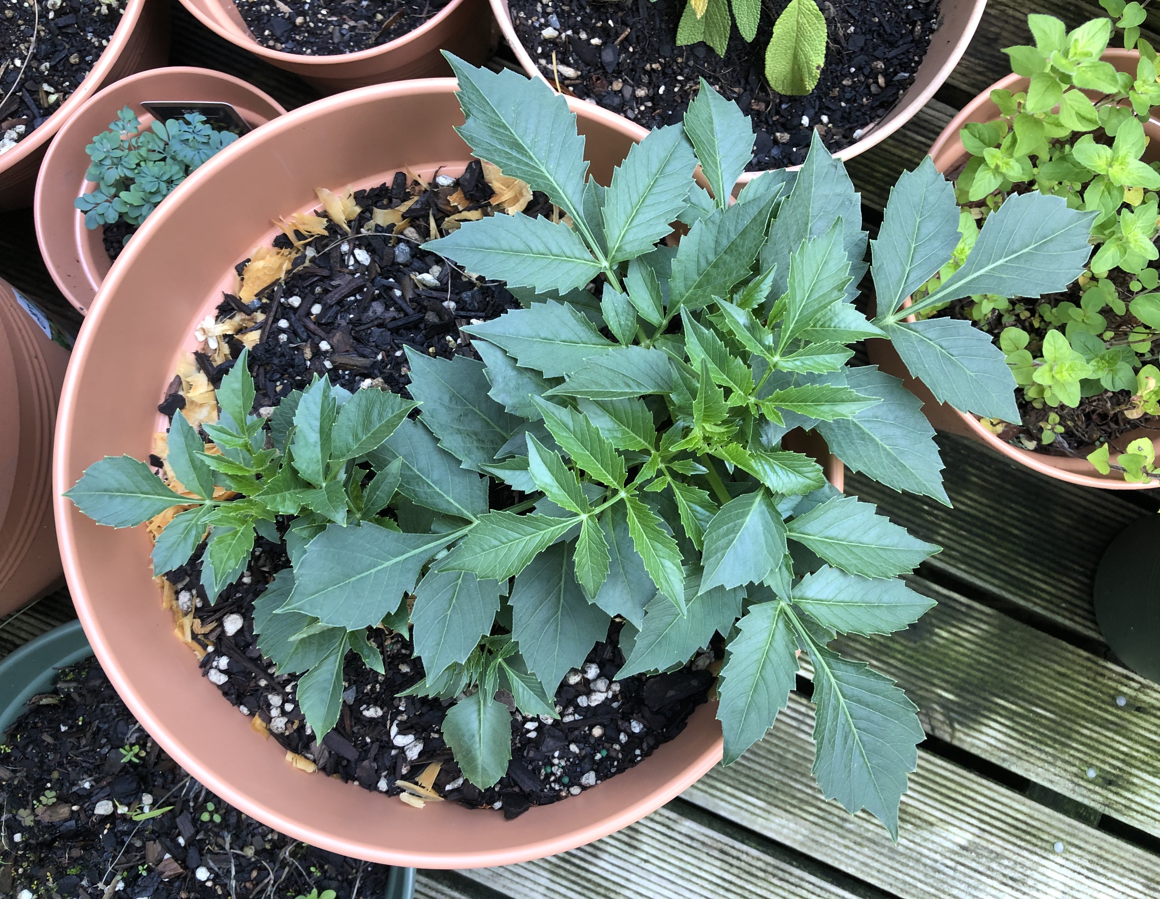 Next up, things appearing above the surface: the hymenocallis, dahlias and eucomis all showing signs of life. The sunflower too, though where the second one has gone I don’t know – maybe eaten.