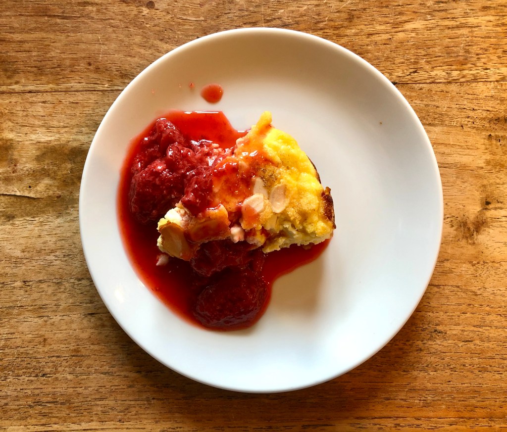 No small pleasures post would be complete without some mention of food. What is it about Christmas ham? I am sure it multiplies as it lies in the fridge, for no matter how much you think you have eaten, there is always some left. On Sunday, I made a quiche with some of the leftovers, adding a few slices of tomato and a topping of cheese. I served it with peas braised with spring onions and lettuce to use up a few other things from the fridge. After my adventures in jigsaw land, I could not resist picking up a bunch of baby carrots, possibly to roast. I made a tabbouleh for dinner tonight with lots of parsley, sweetcorn (it had to be used) and a nectarine (Nigel Slater’s idea) to have with chicken. For a special dessert, and because it is the season, I made a Swedish curd cake or ostkaka. Made with cottage cheese, it comes from my husband’s county of Småland – check out an old post of mine from 2019. I used Brontë Aurell’s recipe from Scandikitchen Summer and served it with a strawberry compote.