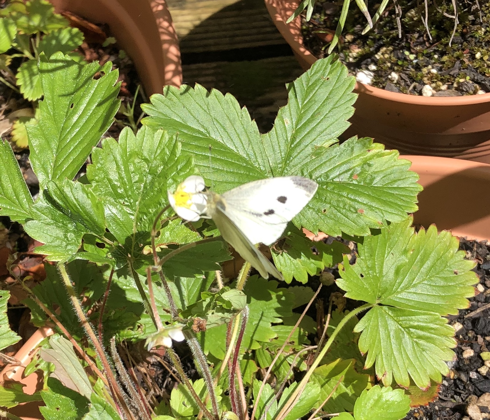 At number three, the wild strawberry plant, which is still producing flowers (and I ate two berries this week) though I feel is in some serious need of some loving care. A white butterfly was also enjoying the plant – I believe this is a female as it has two spots on the wings. It is an introduced species, and of course is just a bit destructive around brassicas!