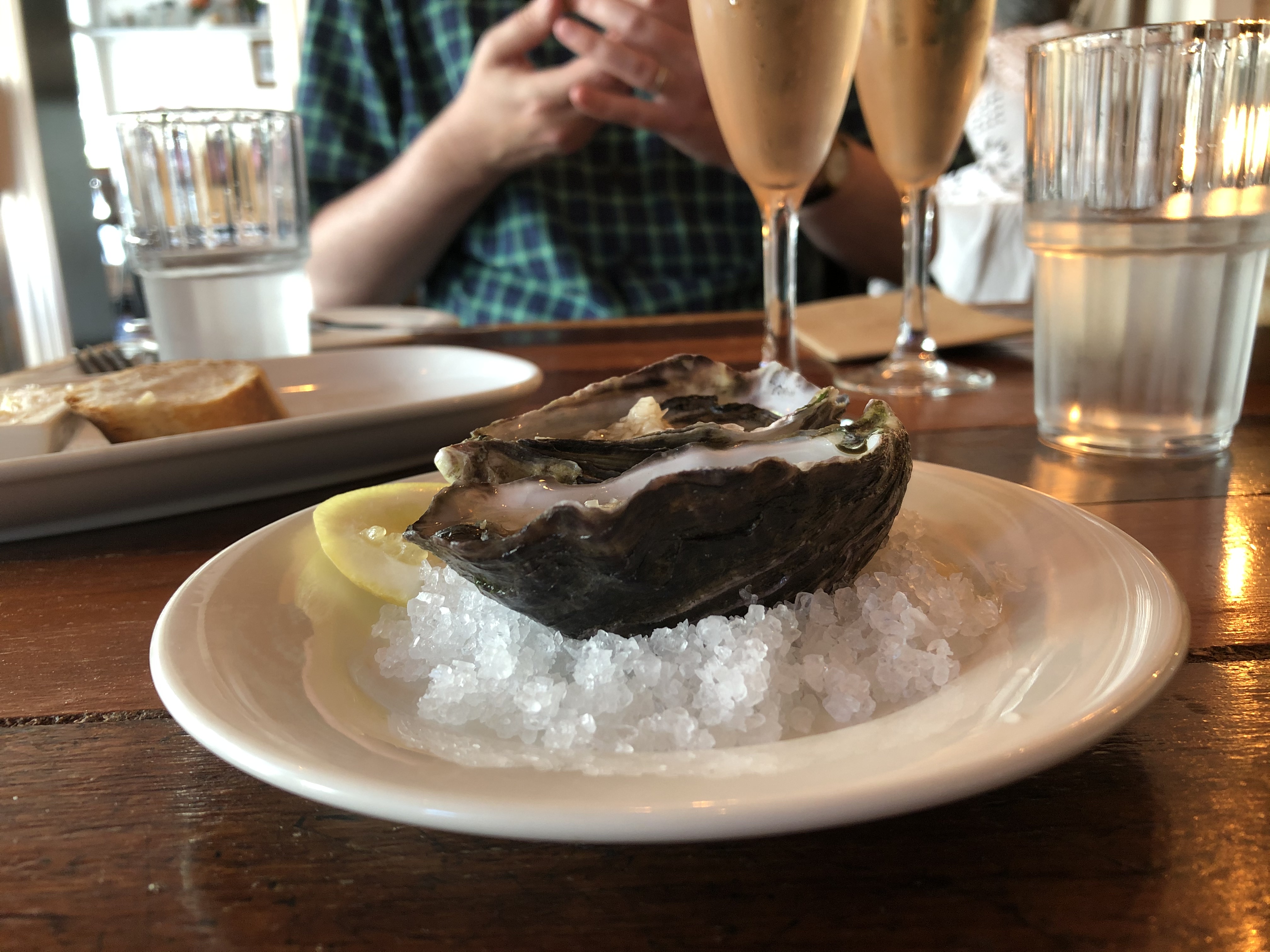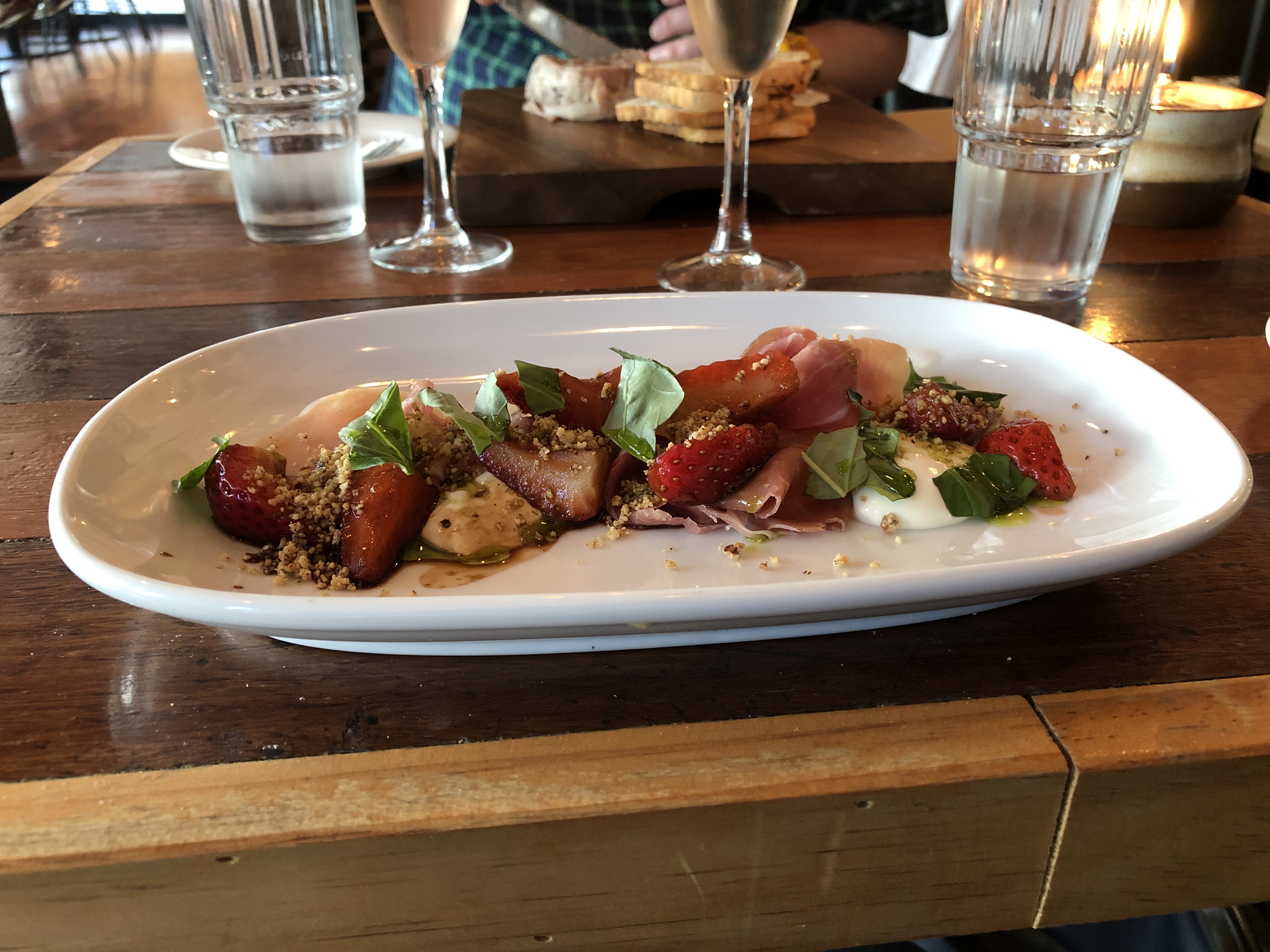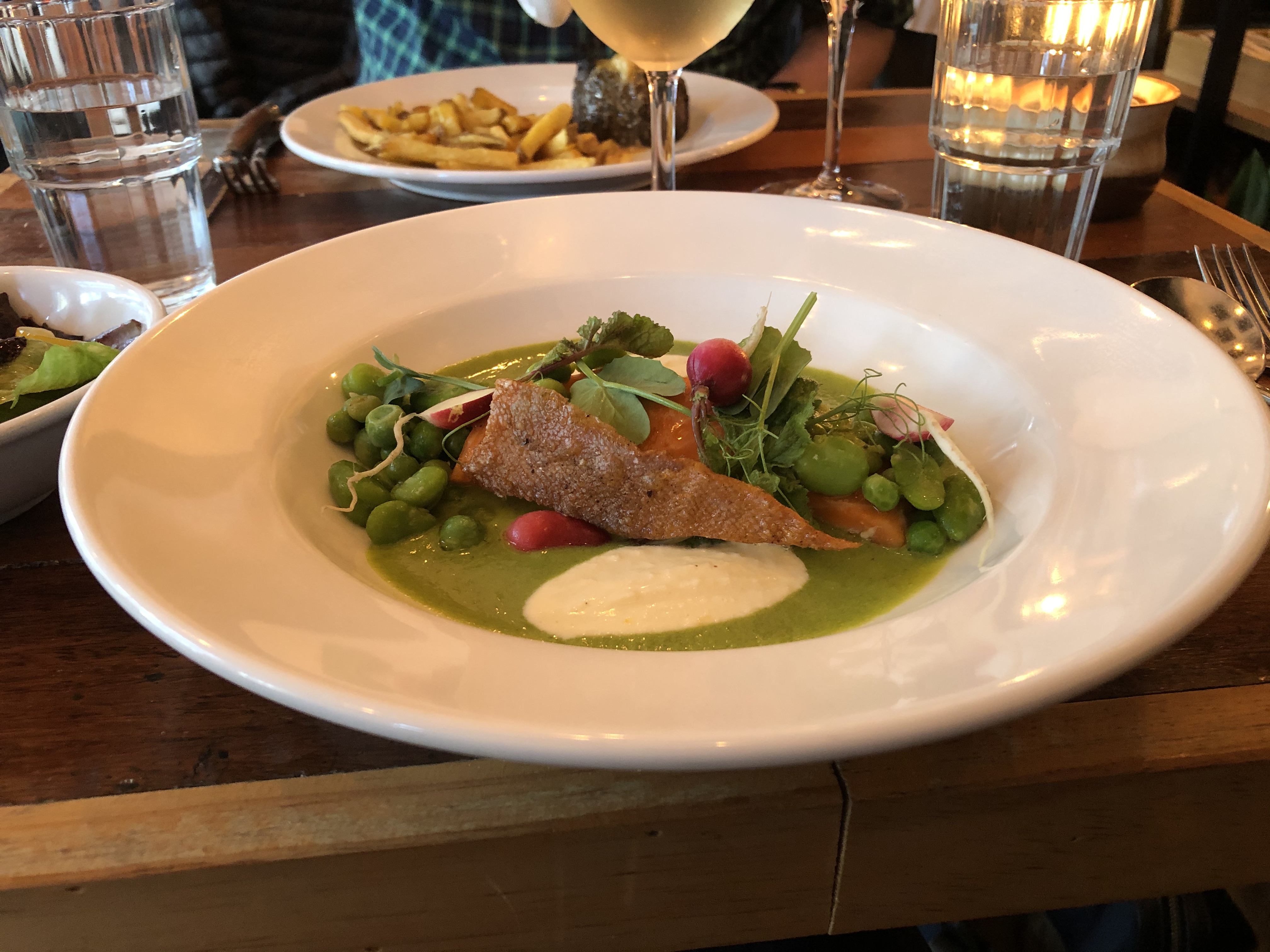 On Hogmanay, we went for dinner at Daisy’s. I couldn’t resist having a couple of oysters to start with, enjoying some pink sparkling wine alongside. For my first course I had an interesting salad combination of strawberries, prosciutto and whipped goat’s cheese which was really delicious and then confit salmon, with green pea, lemon ricotta and little baby radishes, a lovely fresh summer dish. Karl had the pork and duck terrine and steak frites, also given a good review.