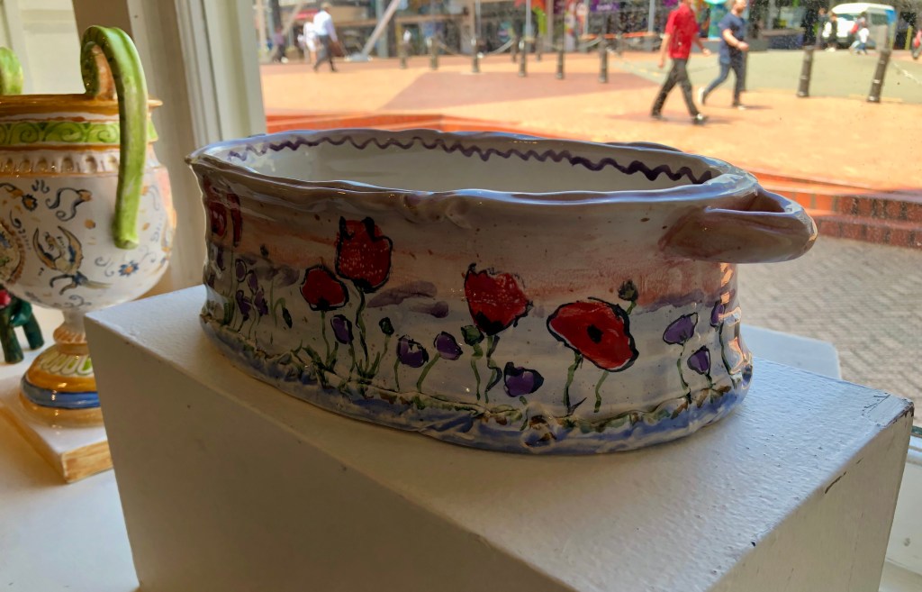 I work in the city, and always make sure I get a walk at lunch time. Often there are small errands to run, but sometimes it is nice to pop into an exhibition and really switch off from work. On Monday, I went to the summer exhibition at the New Zealand Academy of Fine Arts. Works are for sale, and I really liked this planter with poppies and cornflowers, so made a note of the potter so I can keep my eyes open for her work.