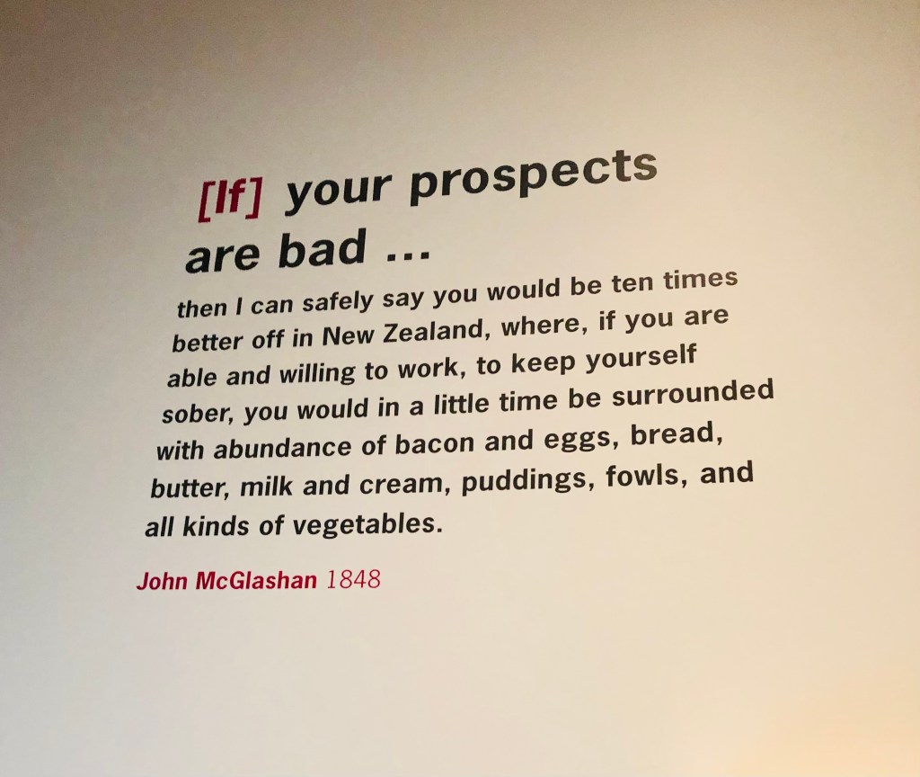 The Otago Settler’s Museum is probably my favourite museum in Dunedin. This museum traces the lives of the indigenous Māori and various migrant groups who have moved to the region. It is a wonderful collection of all sorts of objects, photographs and ephemera. Below you can see the room filled with photographs of the first settlers (including the splendid fellow in the kilt) and an 1848 advertisement as to why you should move to New Zealand (for an abundance of puddings?).