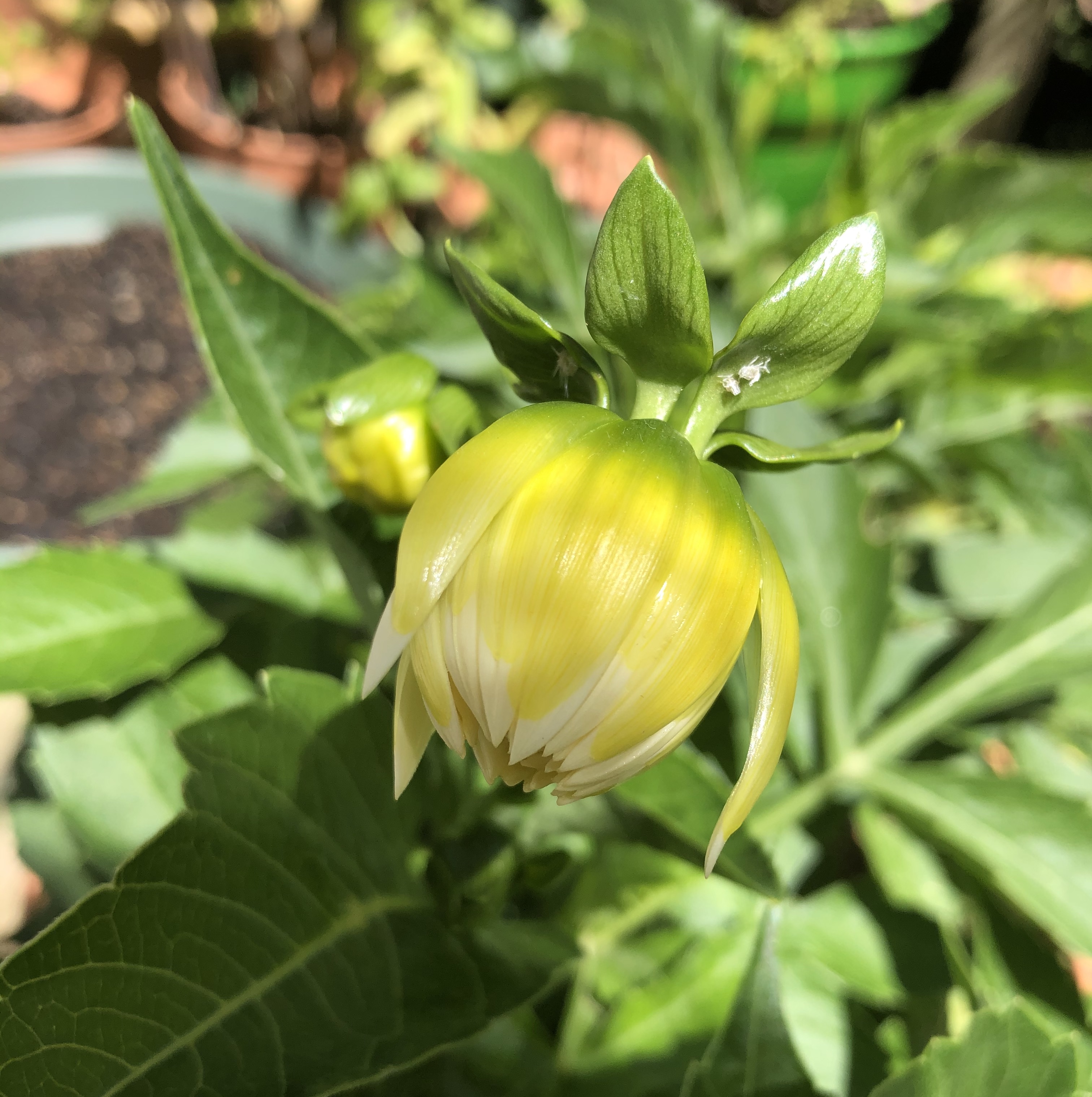 So first up, the featured image and the one below…the surviving dahlia is about to flower. I looked back to check the variety (the label I put on it has blown away) and it is Art Fair. And yes there were little bugs on it – consequently removed. I should see white blooms soon.