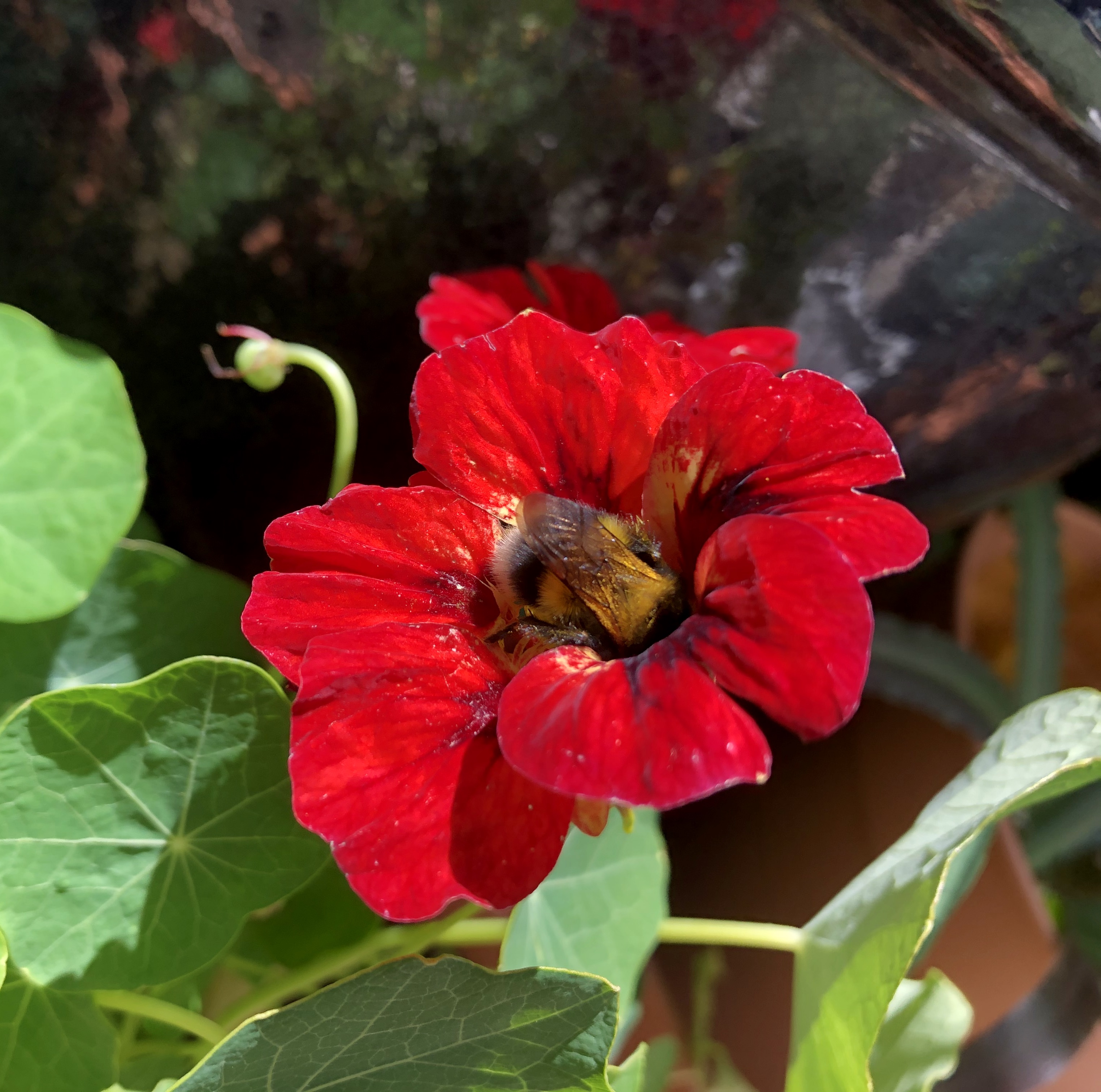 Next up, this weeks nasturtium pictures, because there just have to be some. The bees certainly like them as you can just see. The yellow flowers are the ones I brought in after the storm the week before, and they have done so well in a vase of water, with all the little buds coming out. I feel this is such a bonus somehow.