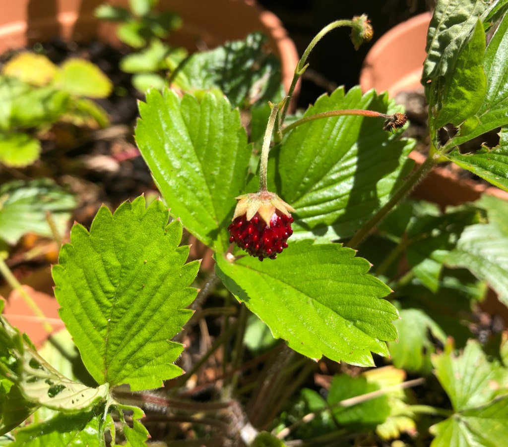 As I was looking around to see how things were and looking for this to photograph and found this nice, ripe wild strawberry. I naturally picked it and ate it and I have to say it was bursting with flavour. Glad I got to it before the birds.