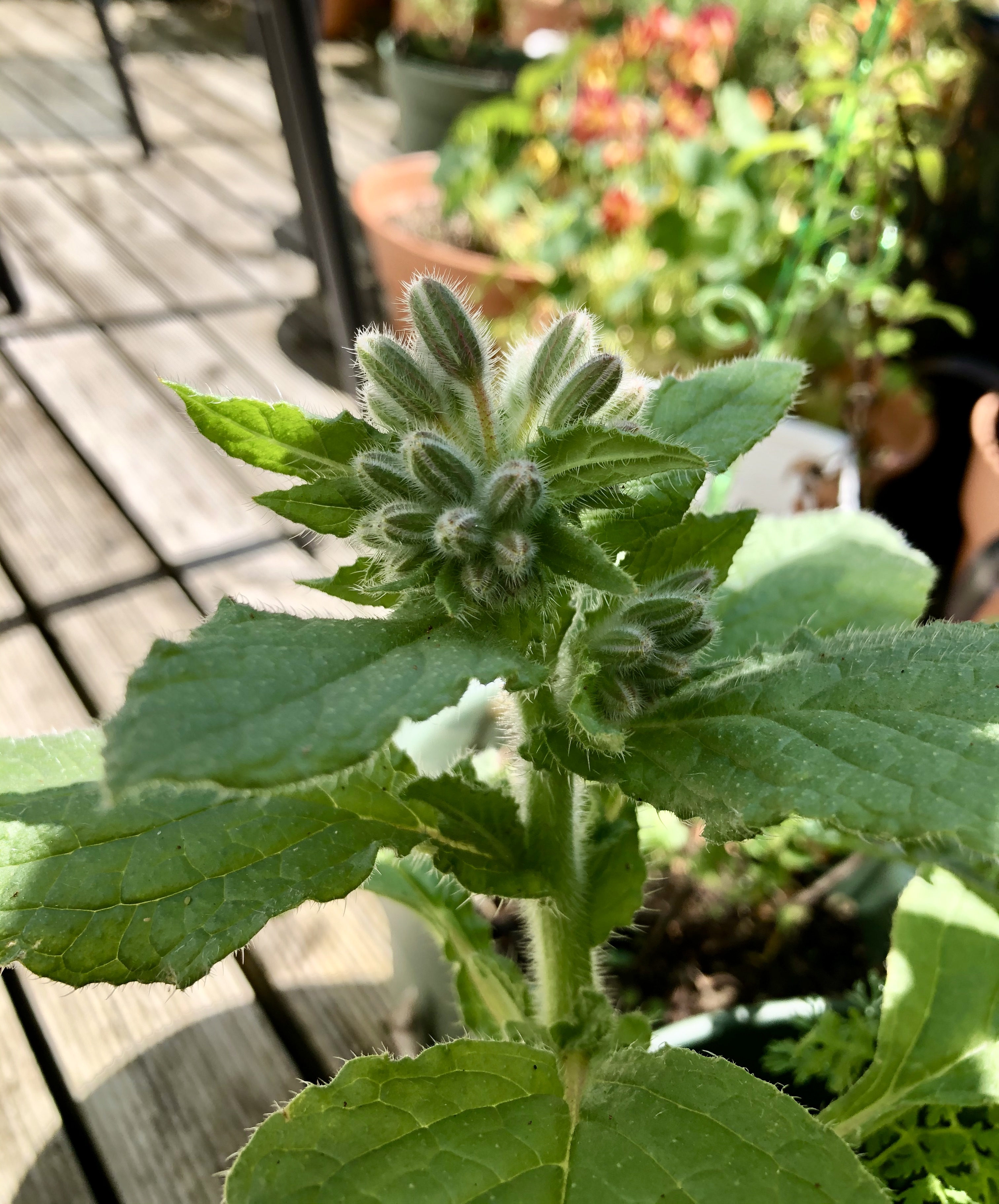 Over to the herb garden, the budget lavender is proving a great success and has flowered really well this summer. The lemon balm has made a wonderful recovery since I cut it back, and we have lots of parsley and sage for using in the kitchen. There are still a few gorgeous echinacea flowers brightening up the deck too – we have had such a lot of joy from this plant this year. And when I bought the bee house, it came with a packet of mixed seeds which I just sprinkled into a pot to see what happened. Well, there are marigolds and also this borage, which should be flowering soon I hope.
