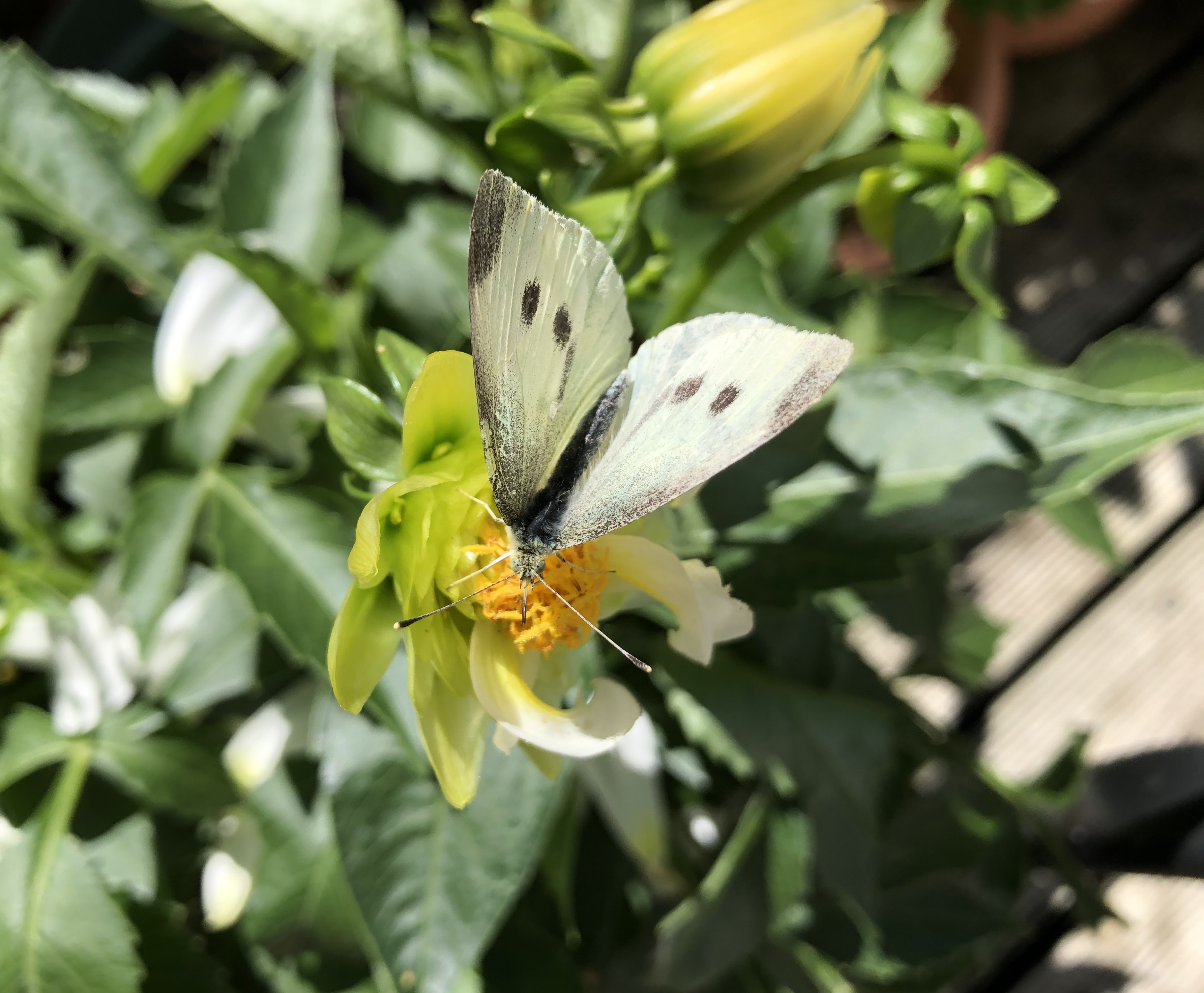Finally, where we began this post with a sudden invasion (well, I counted at least three) of cabbage white butterflies, enjoying almost everything from the wild strawberry, to the radishes, to the sunflower…you name it. While looking at the butterflies, I noticed that there are lots of flowers on the wild strawberry plant, so hopefully I can grab a few mini berries before the birds do in the weeks to come.