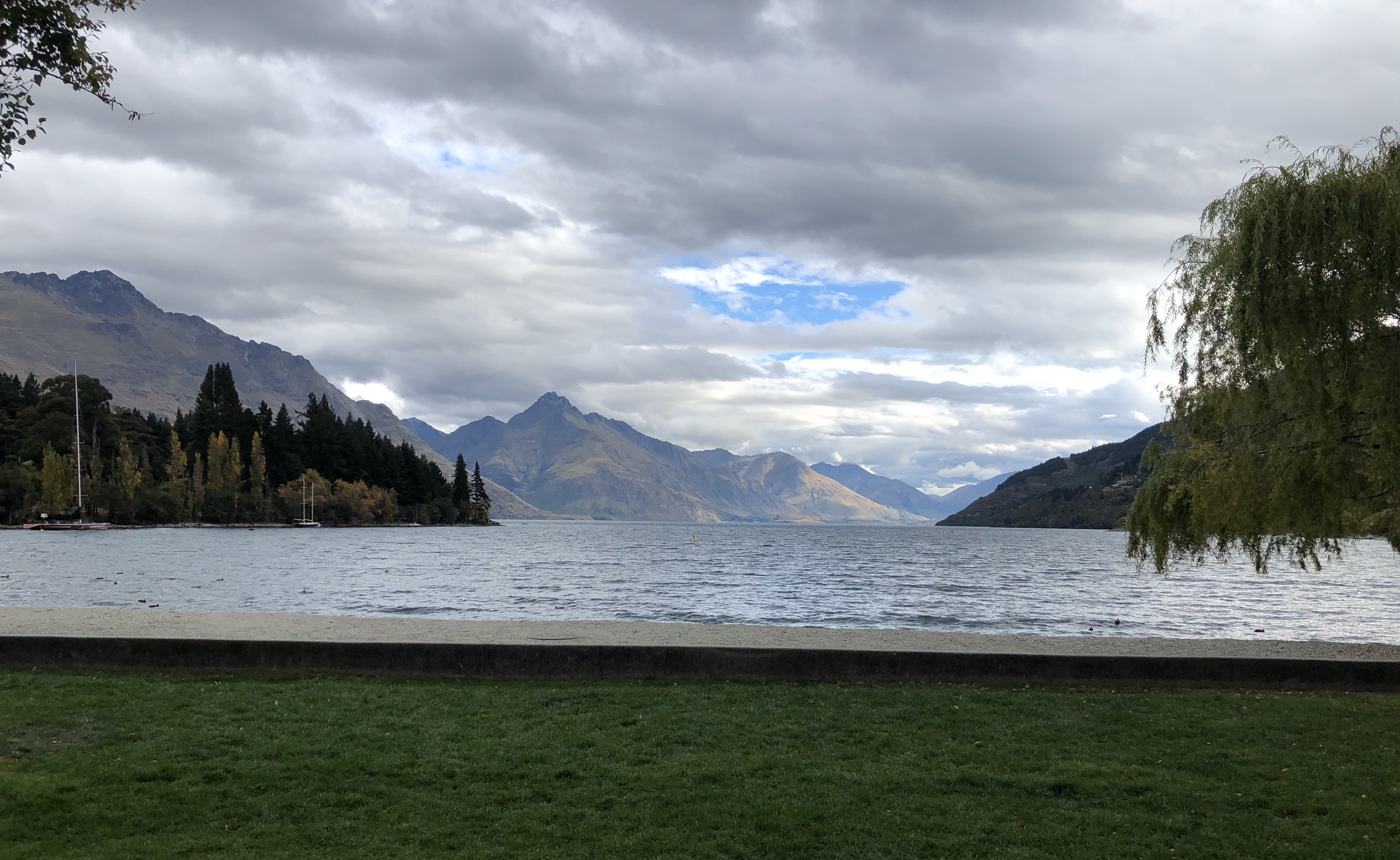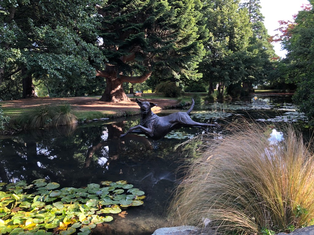 Back to activities…and before dinner on Saturday, we went for a stroll in Queenstown Gardens. I loved this statue of a leaping dog, next to the little stone bridge. You can see a little autumn colour below, and the view across the lake through the trees. After our walk, we stopped for a drink before dinner at a little place by the water – see the featured image at the top of the post of our view (unless you are reading this on an iPhone, in which case go to the home page of the blog to see).