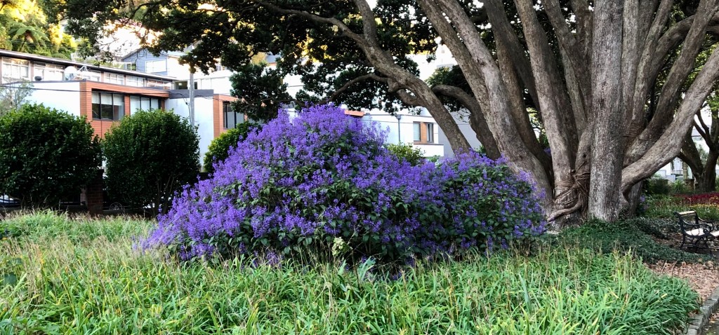 In a week that saw the opening of the Trans Tasman bubble, the death at far too early an age of choreographer Liam Scarlett and the funeral of Prince Philip, there were lots of small pleasures to note this week. There was sitting and reading by the waterfront one lunch time (see the featured image at the top of the post – if you can that is – depends on what device you are using), putting on the blue and white checked duvet covers that for some reason remind me of Sweden, finishing a good book and just sitting enjoying a cup of coffee after dinner with my husband. Oh yes…and watching Charlie sleeping and listening to his sweet snoring as well as enjoying these gorgeous purple blooms on the lamiaceae in the Botanic Gardens.
