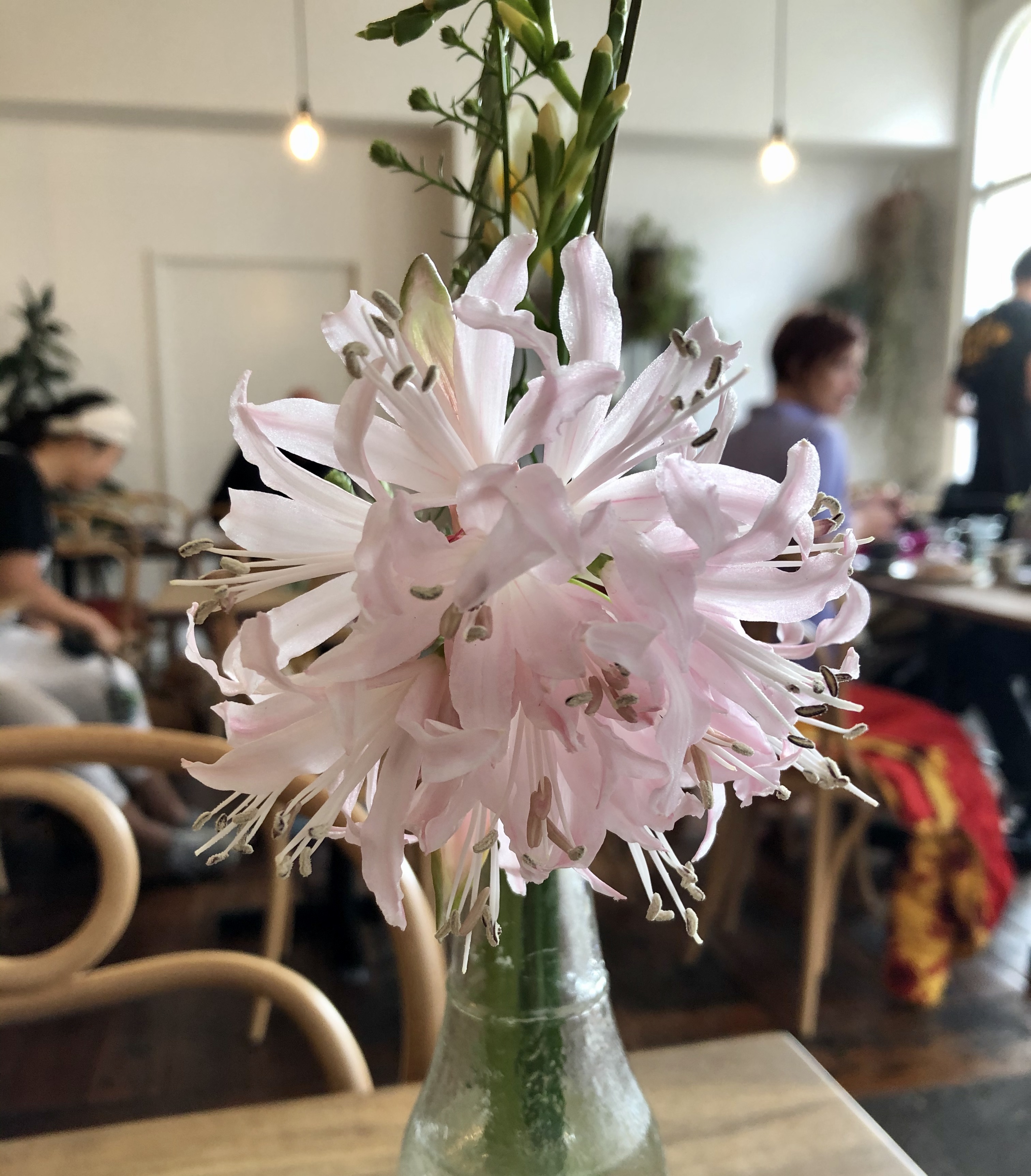 Another small pleasure this week was a return to my favourite cafe, Squirrel, on Saturday morning. I had woken early, so just jumped on a bus, ate my toast and read my book, said hello to a couple of people, then walked back to my Pilates class. I can’t see me doing this every week, but good to know it can be done, even though it means a slightly odd route to class. The flowers below were on the table I sat at.