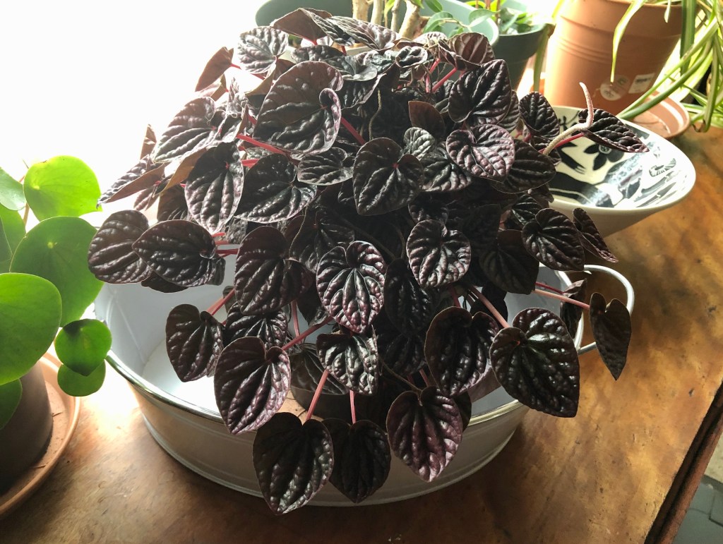 Finally, since it is raining, I’ll end today with two indoor plants, the newly acquired Peperomia Polybotrya ‘Raindrop’. I know this type of plant is fashionable at the moment, but it is attractive and I needed/wanted another bit of green in the house. Sitting beside it is the Peperomia ‘Burgundy Delight which I bought a while back. It seems to like the spot it is in at least.