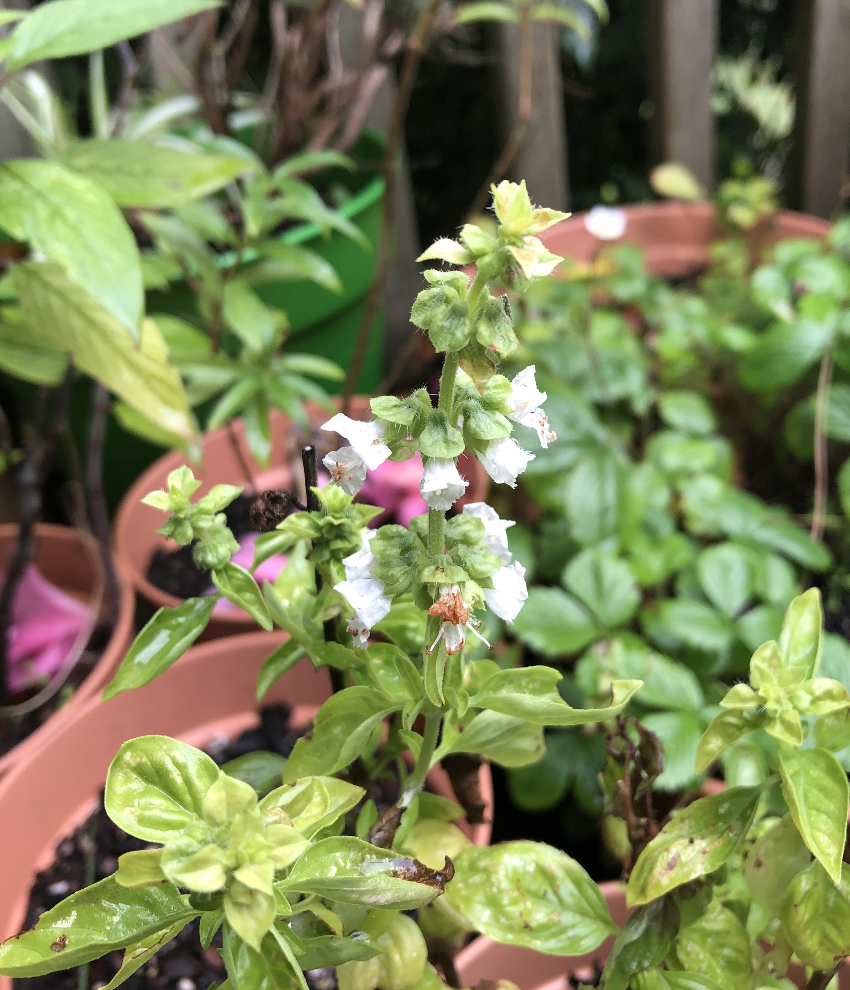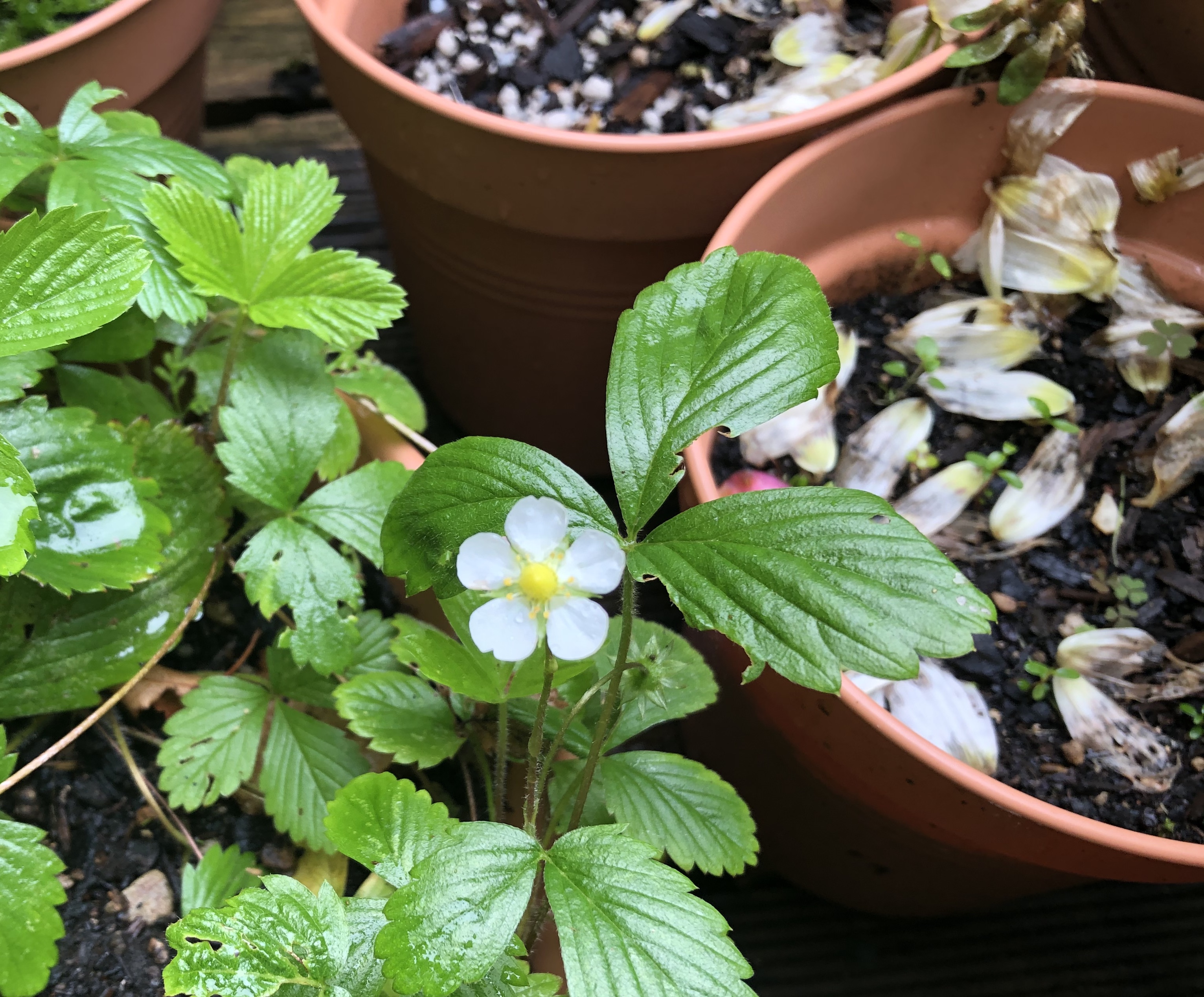 Now to the pick and mix corner, where we have some flowers on the shaggy supermarket basil that is still going on. The sun and rain has boosted the pineapple sage, and the variegated sage is also doing fine. The wild strawberry plant continues to flower and provide the occasional little fruit to keep my eye on before the birds help themselves.