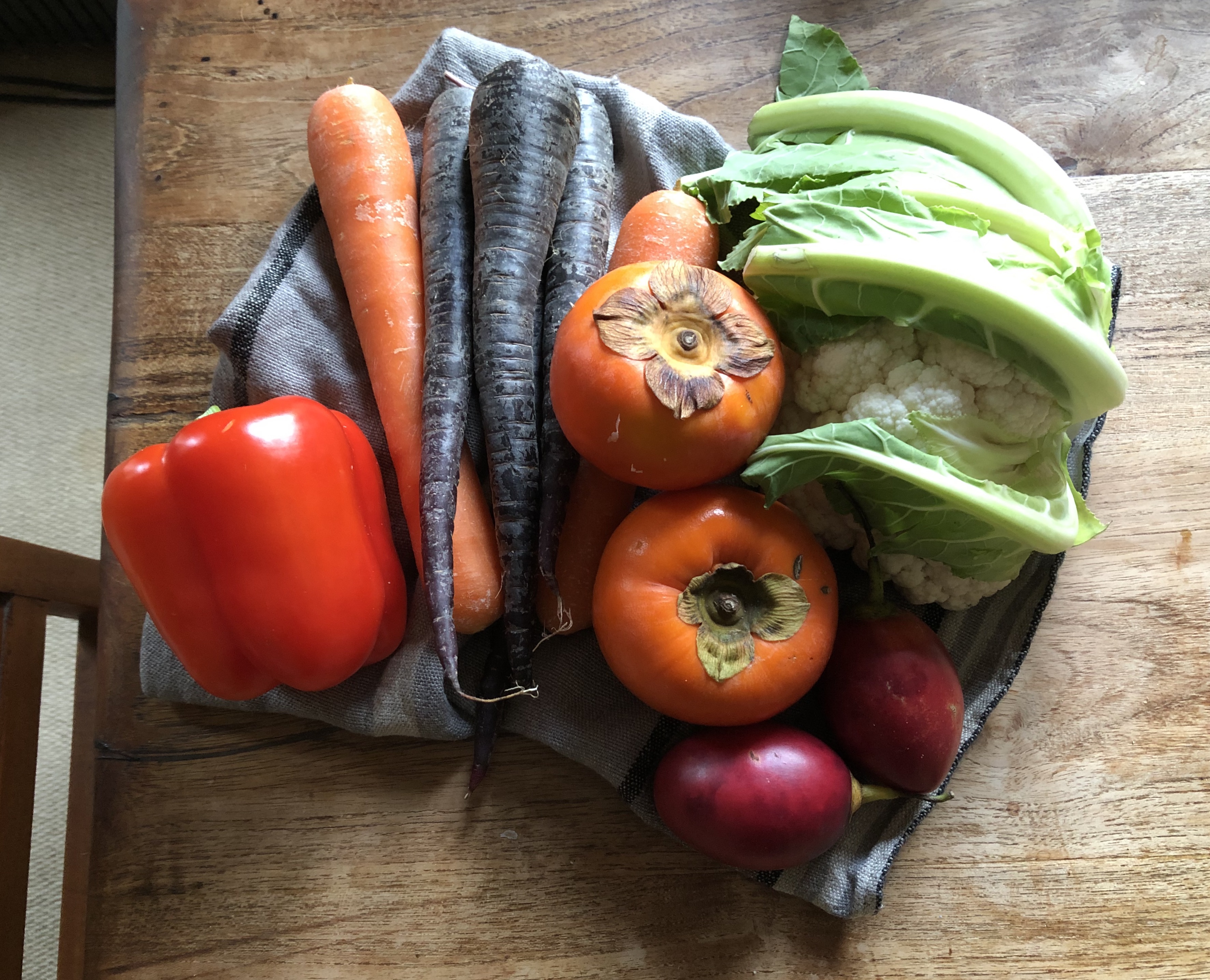 If we were having coffee…or even a cup of tea…I would tell you that I managed to get to the vegetable market today. I would tell you there were so many good looking things from red cabbage, to pumpkins, to bright green kale, cavolo nero and silver beet. There were purple and green Brussels sprouts, and orange and deep purple carrots, just so many beautiful colours and shapes. You agree and ask what I bought and I said half a cauliflower to roast and make salad for the rest of the week’s lunch boxes, some of those glorious looking carrots, a bright and glossy red capsicum and more persimmons and tamarillos. I still have sprouts and some greens to use, so resisted temptation to buy even more.