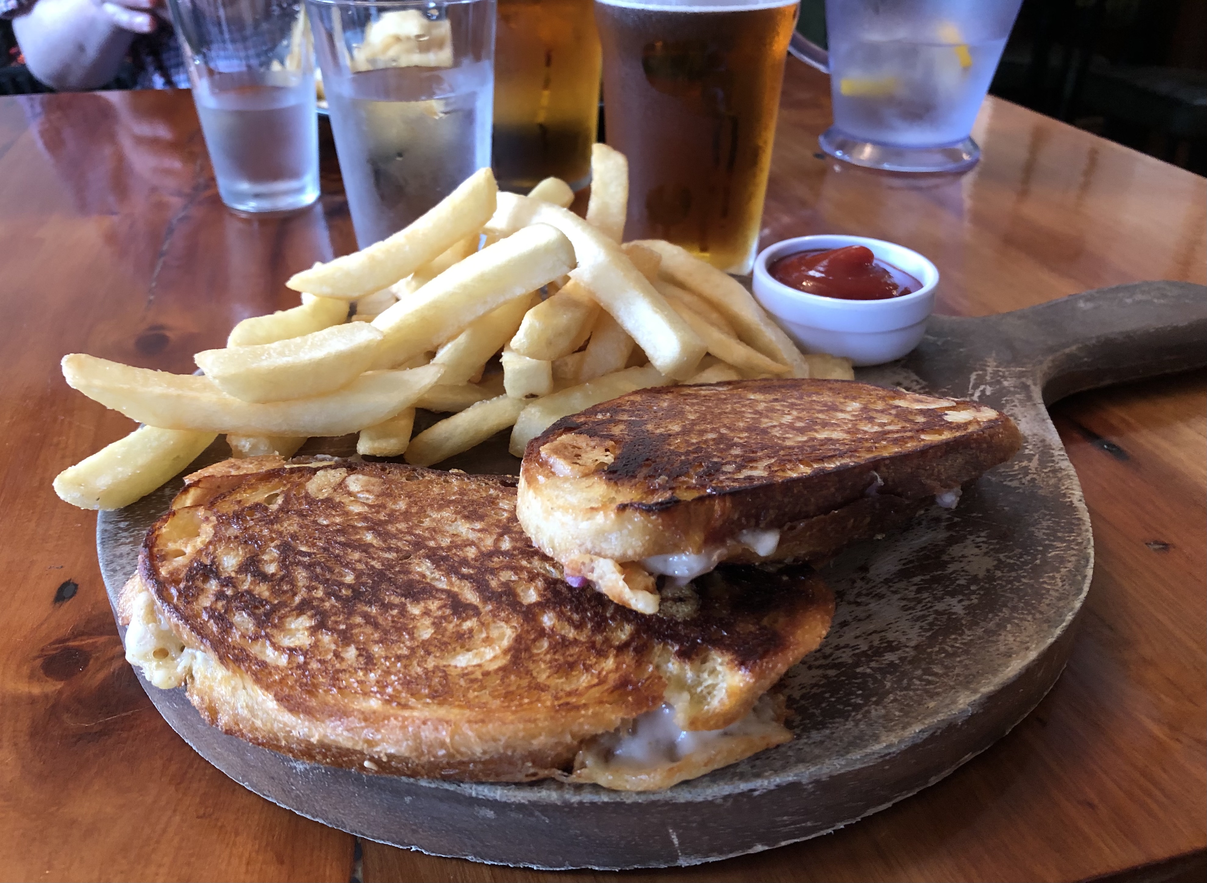 No Small Pleasures post would be complete without food….so below we have the eggs Benedict I had for Sunday breakfast, substantial cheese and ham toasted sandwiches for lunch (Karl had his birthday wish of a burger and beer), and the pear and walnut tart we had for dessert on Sunday evening in the hotel restaurant.