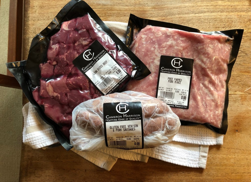 So there was no vegetable market on Wednesday and no opportunity to browse the supermarket this weekend. My husband is the designated shopper again, and I make careful lists, but it isn’t the same as looking to see what looks good this week. I put in an order to Cameron Harrison butcher and received some excellent venison and pork sausages, some beef to make a hearty carbonade a la Flamande and some pork mince to….do something with as yet undecided. Bread was delivered from Arobake on Saturday morning, along with their very good rhubarb and custard tarts, which we enjoyed with a cup of tea.