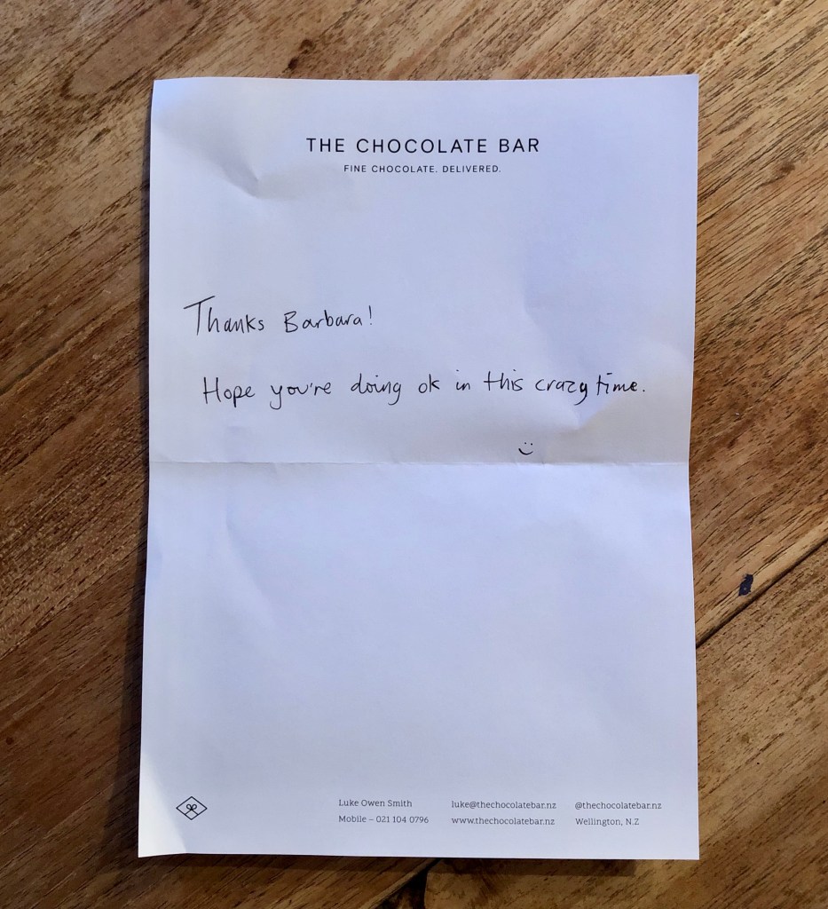 So we stay ‘Level 2 Delta’ here in New Zealand for another week, while Auckland remains tightly locked down at Level 4. This has come as nor surprise, but a little disappointing of course. Still, vaccination take-up is still on the rise, though a whole lot more people need to get along and get ‘jabbed’. Anyway, we moved from Level 3 to Level 2 on Wednesday, and this meant that I could keep my chiropractor and dental hygienist appointments, as well as go back to Pilates in the studio. While a visit to the dental hygienist is not necessarily a small pleasure, being able to go was – I am sure you all know what I mean! I went back to the office today, but was delighted to come home and find not only a cat happy to see me but a new supply of posh chocolate from The Chocolate Bar. We’ve still got a bar and a couple of bits left from my last order to enjoy as well – and isn’t the note that came with the chocolate just so nice?
