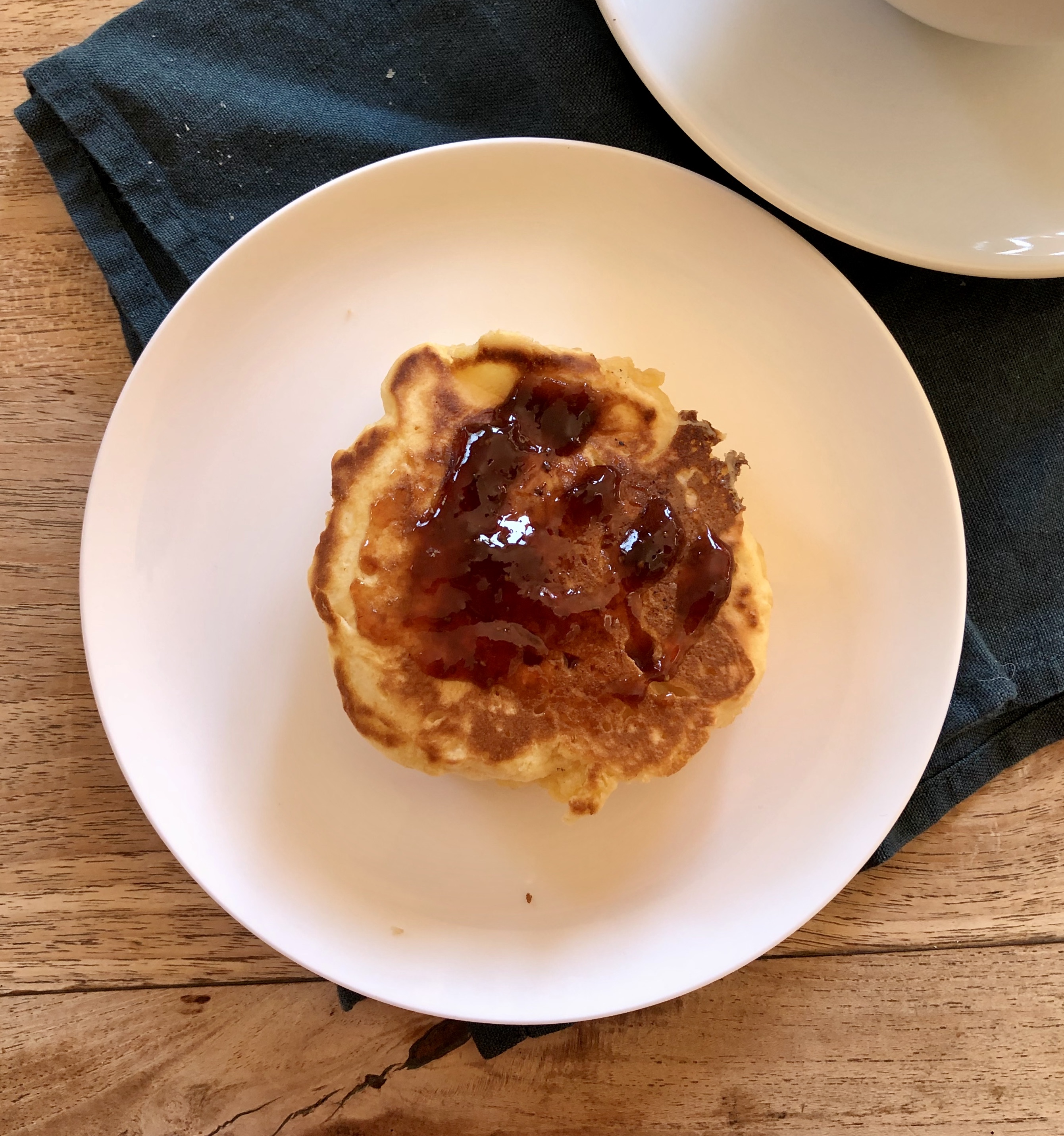 Well-grease of baking griddle or heavy frying pan (which is what I used). Heat until a drop of water sprinkled on the surface skips about in little bubbles or balls. Mix 100g self-raising flour with a pinch of salt and 50g caster (fine) sugar. Add one egg, and gradually beat in about 60ml of milk to make a thick batter. Bake 2 or 3 at a time by dropping spoonfuls of the mixture onto the griddle of frying pan. Cook each side of the scone until brown – about three minutes.