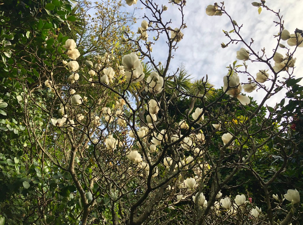 Finally, the magnolia, which is really in full flower now. It is so difficult to get a good picture of it, so please excuse me. The featured image at the top of the post (you can see it if you go to the actual website) also shows it off, with a kowhai tree covered in yellow flowers, behind it. This native plant is a real indicator of spring, and the birds love it. That picture, by the way, is what you see when you arrive at our house, such a joy after a day at work.