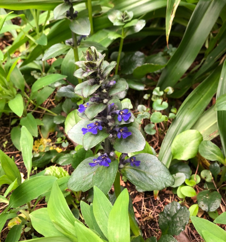 At number two, the ajuga are flowering nicely. I like the flowers close up, but am not so keen on the overall shape. Still they nestle in places at the side of the house, and seem to flourish, so I will leave them there to do their thing.