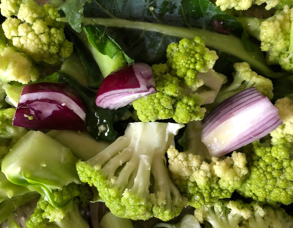 I used a red onion to offer up a nice colour contrast with the broccoflower. I thought I had some pistachio nuts, but I was wrong, so I chopped up a couple of pecan nuts for crunch.