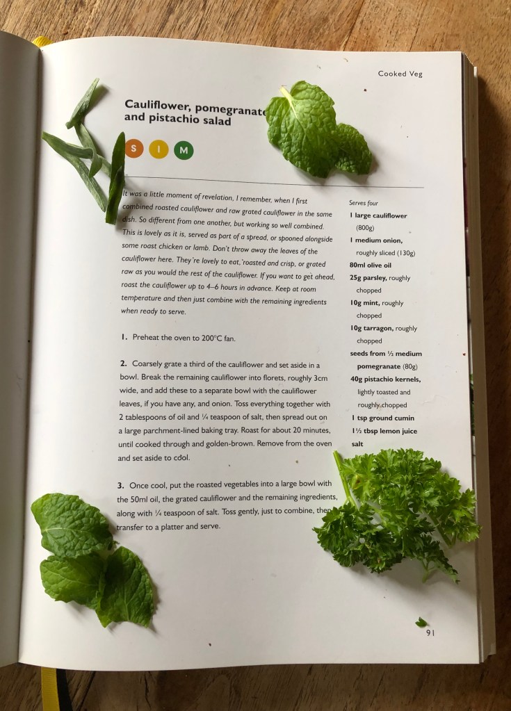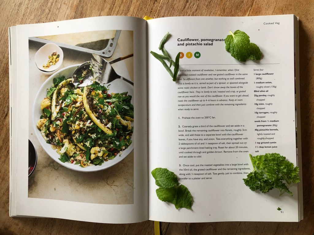 In my weekly Small Pleasures post, I feature things in my shopping basket that week, but usually don’t follow up with what I do with the produce. This week, I used the mushrooms in a sauce to have with port fillet on Tuesday, steamed the asparagus on Sunday to have with a pasta dish and today used the broccoflower, that bright green cross between a cauliflower and broccoli. One of my favourite dishes is the cauliflower, pomegranate and pistachio salad from Ottolenghi’s book Simple. I am sure I have featured this salad before in the blog, but it is so good I make no apologies for repeating myself.