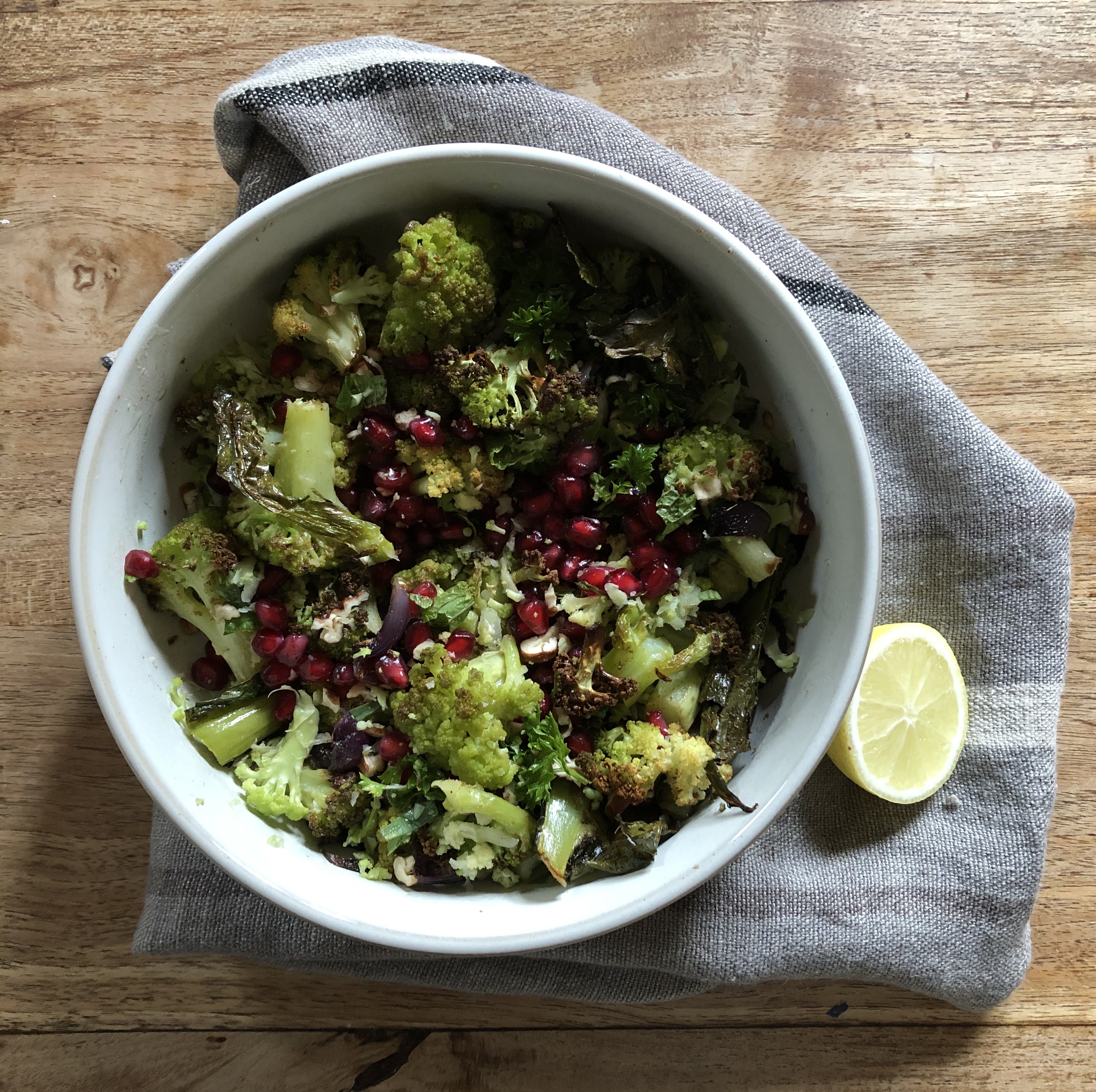 The finished product was a lovely burst of green and red, and the contrasting flavours of the broccoflower, pomegranate seeds and the dressing go so well together. It is even better on the second day for lunch. For dinner, I served it with couscous and lamb burgers made with harissa and crumbled feta through the meat.