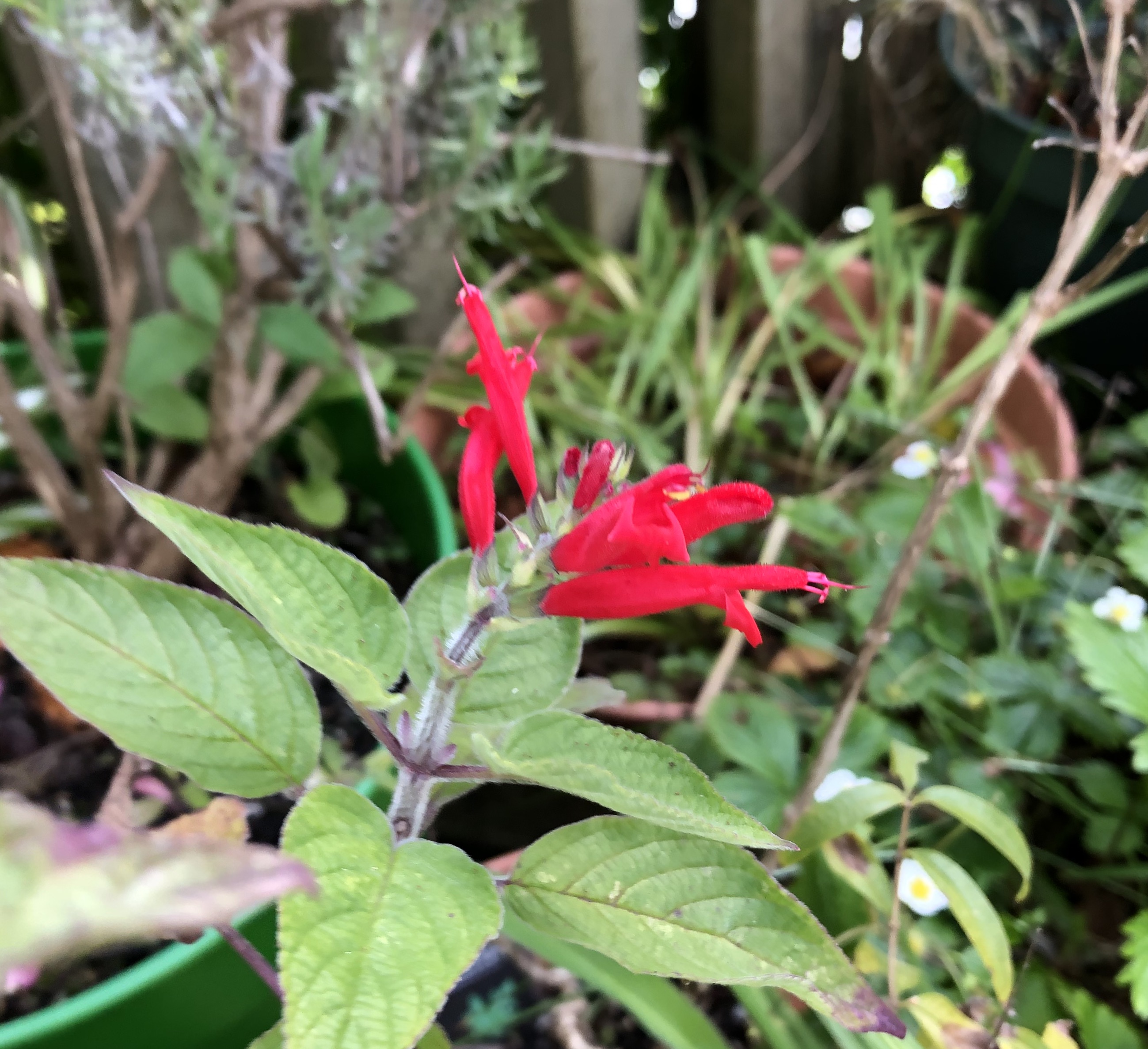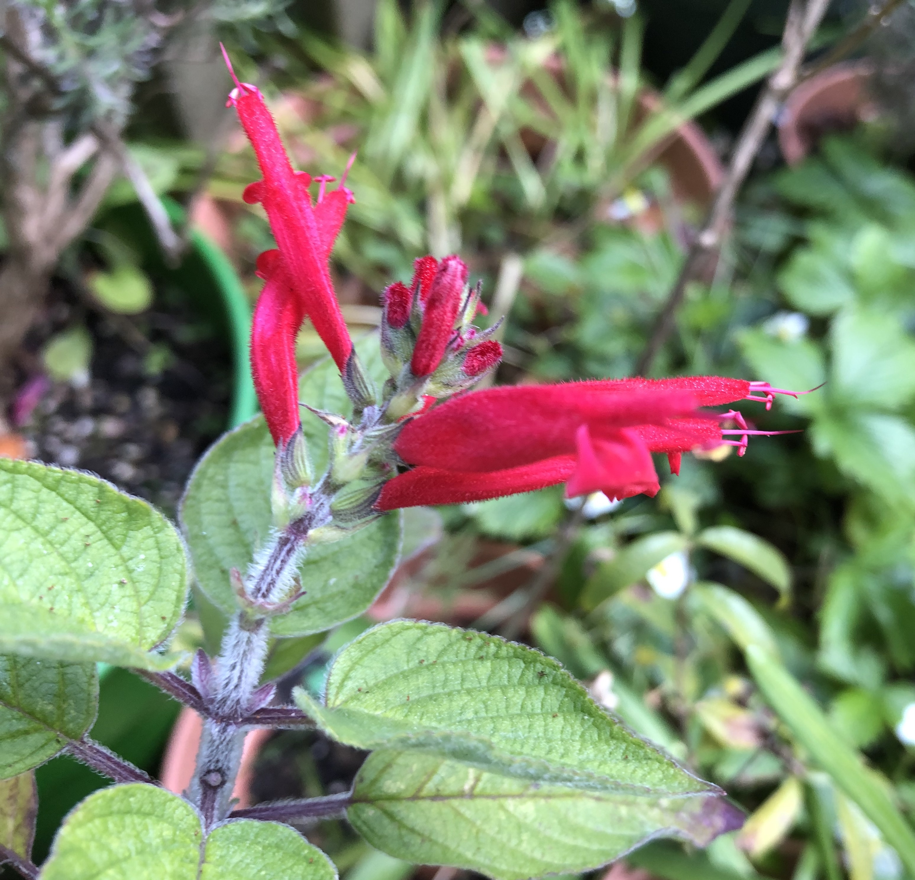 At number four, the gorgeous red flowers on the pineapple sage. I did read that some salvias flower in New Zealand in the late spring, so obviously this is what has happened here. Apparently you can scatter the flowers on salads, though I have yet to try.