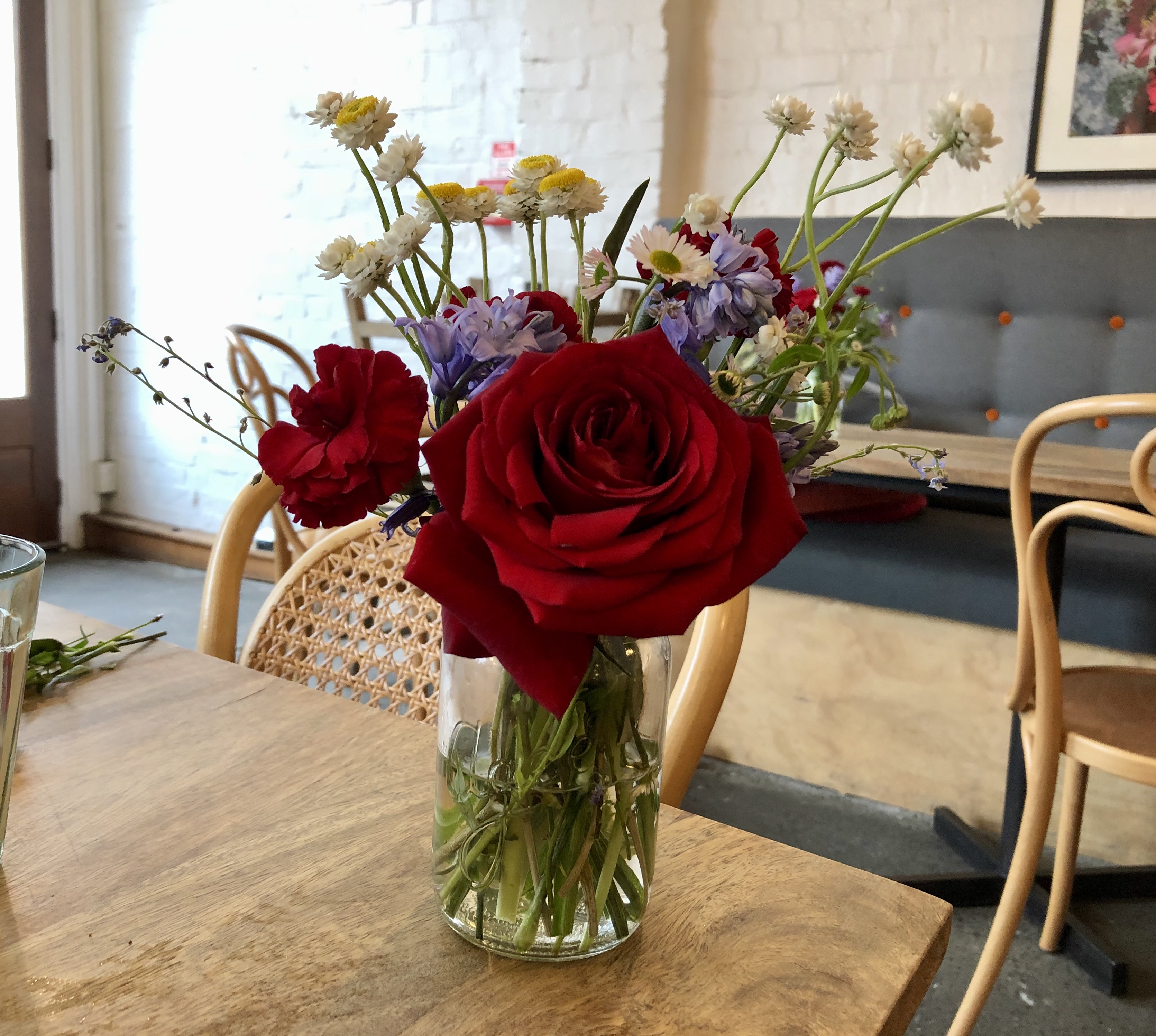 The event was held at next door cafe, Squirrel, which regular readers of the blog will know is a firm favourite of mine. There were six of us participating in the workshop, with owner Mindy Dalzell, taking us through her design thinking and guiding us through putting together little posies to decorate a long lunch table. Her daughter Gretta is also part of the business, and local photographer Ryan McCauley was also present to record the afternoon. This was the second ‘escape’ event, the first having Mexico as a theme and next week will be India.
