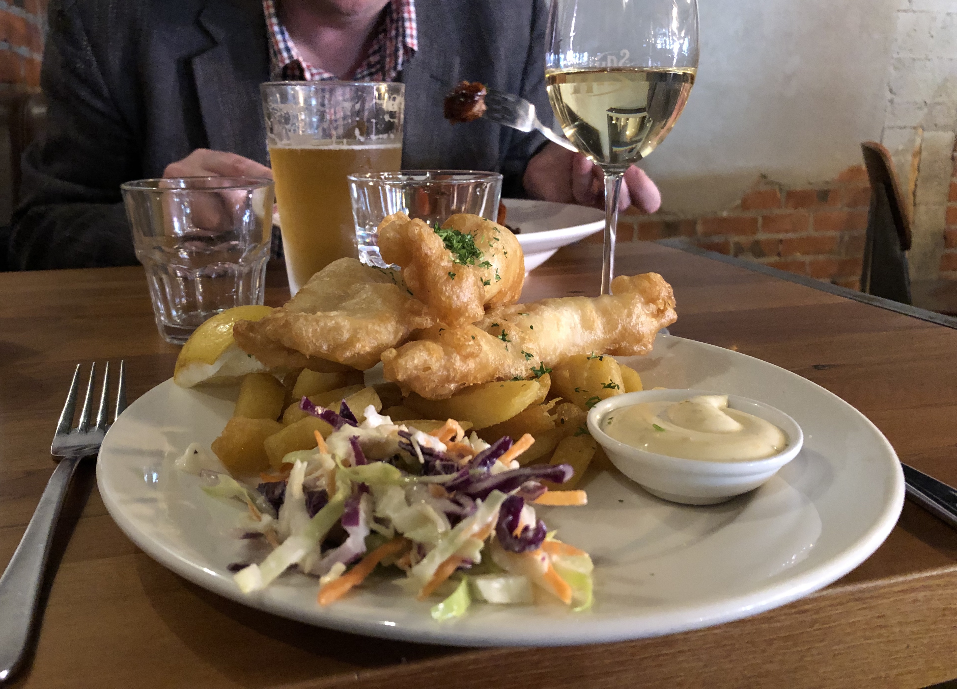 On Thursday, we ate at The Shepherd’s Arms pub in Thorndon, with me opting for fish and chips and Karl sausages and mash. Just the thing! We had lunch on Sunday at Field & Green (see above), with the first rate fish finger sandwiches a firm favourite.