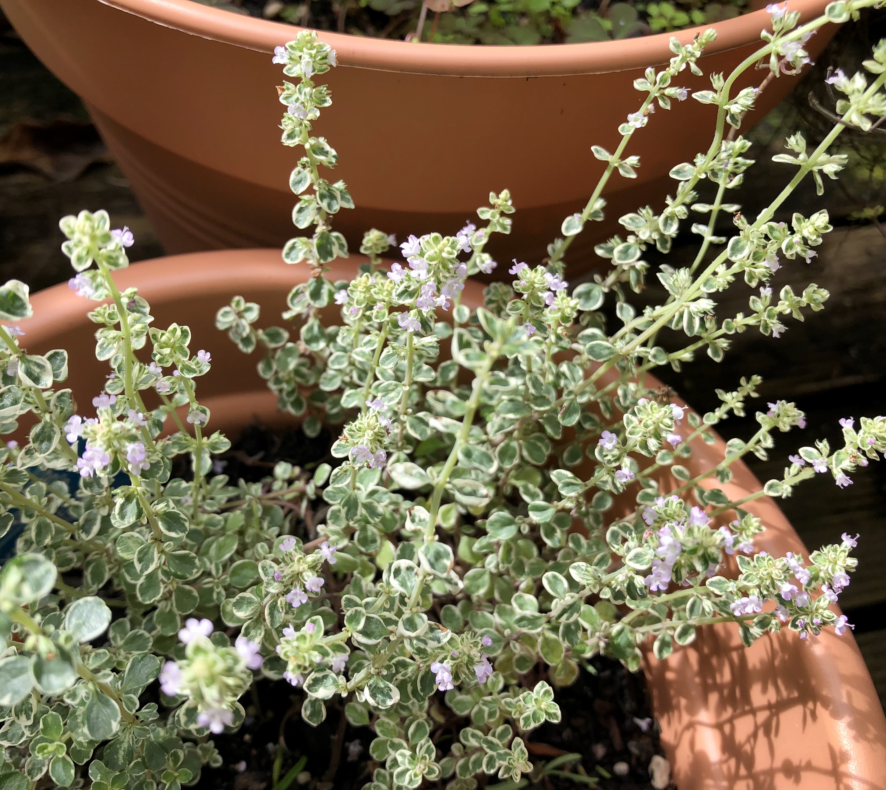 Over to herb corner, with the wild rosemary (I did take a cutting, planted it, and it seems to be doing OK so far) doing well, as is the lemon verbena and the two newest plants, the bergamot lemon (which is also rather tall) and the variegated lemon thyme. You would think I was obsessed with things that smell of lemon…