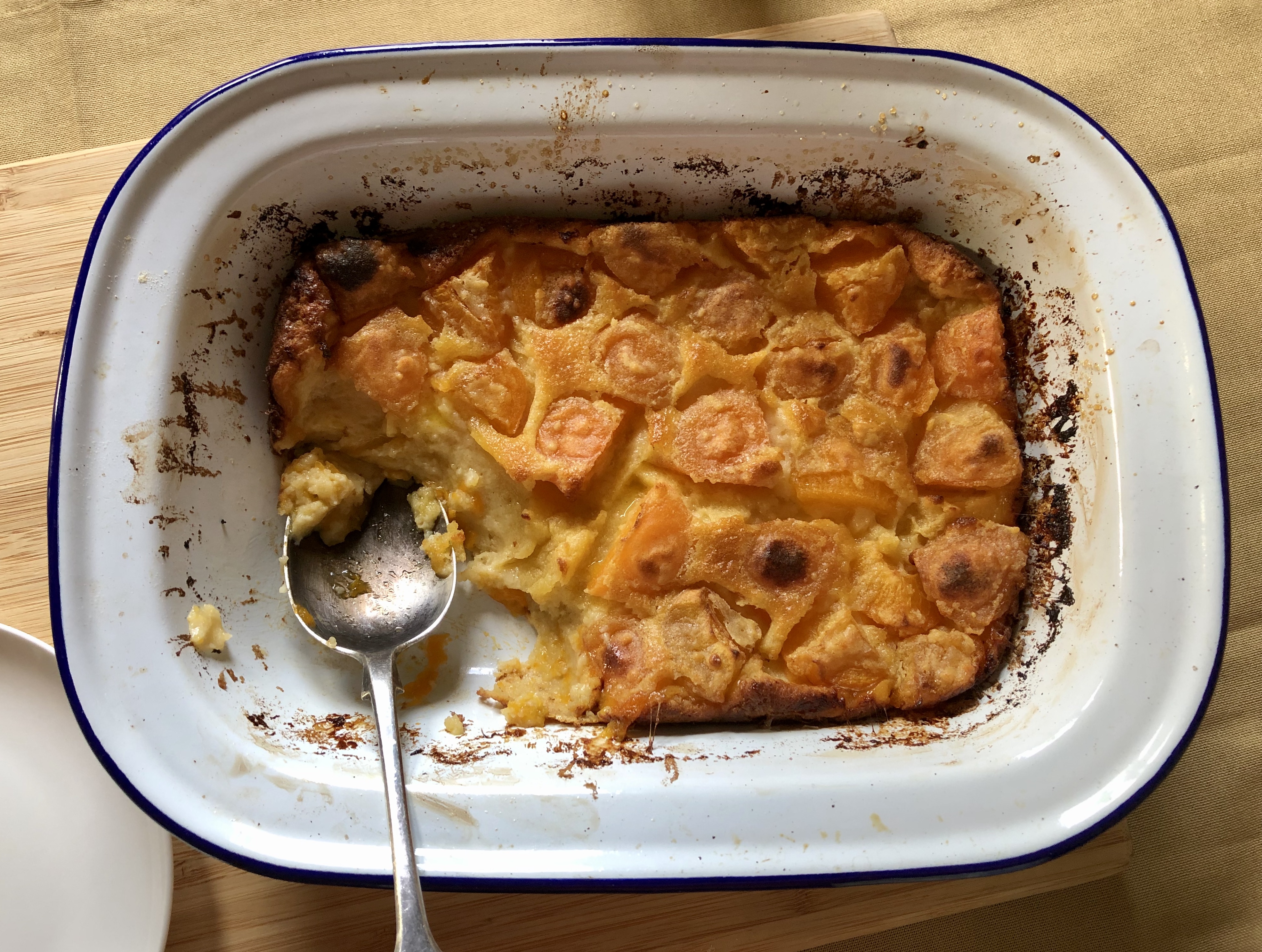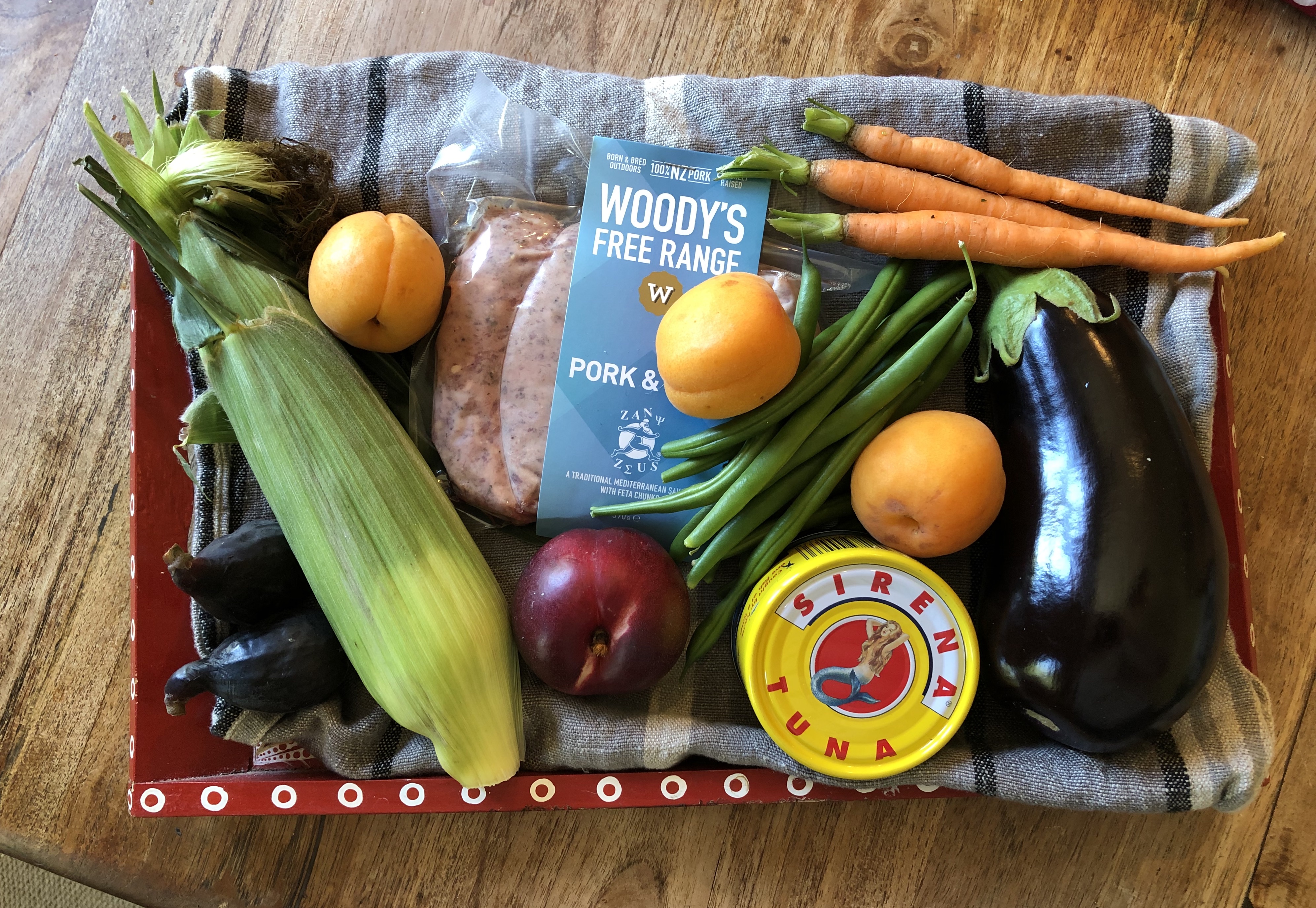 In the basket this week was some really fresh sweetcorn, apricots, nectarines, green beans, wee carrots, an aubergine (eggplant) some tuna for the store cupboard and these interesting sounding pork and feta sausages to have midweek. I also picked up a couple of very ripe figs (bottom left on the tray) which I enjoyed on Sunday morning – a very big small pleasure I can safely say! And…after reading Ju Lyn’s comment about eating apricot clafoutis in France, I just had to make one to enjoy as a treat for Sunday dessert.