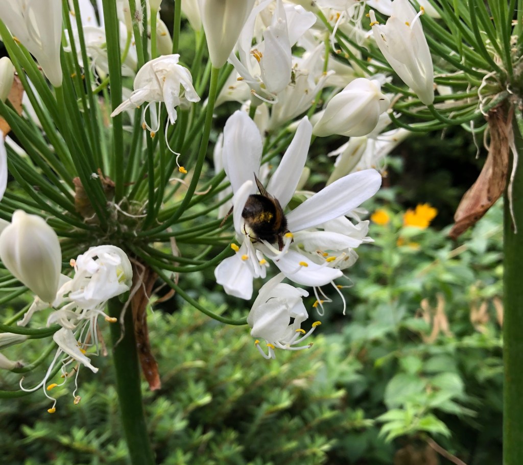 Considering the small pleasures of the week now seems even more important for me. We put brand new linen duvet covers on the bed, which look gorgeous and expensive even though they were just from H&M. There was a lovely long barbecue lunch with friends on Saturday, and, of course, lots of summer weather. Below is a bee feeding on the agapanthus for his Monday breakfast.