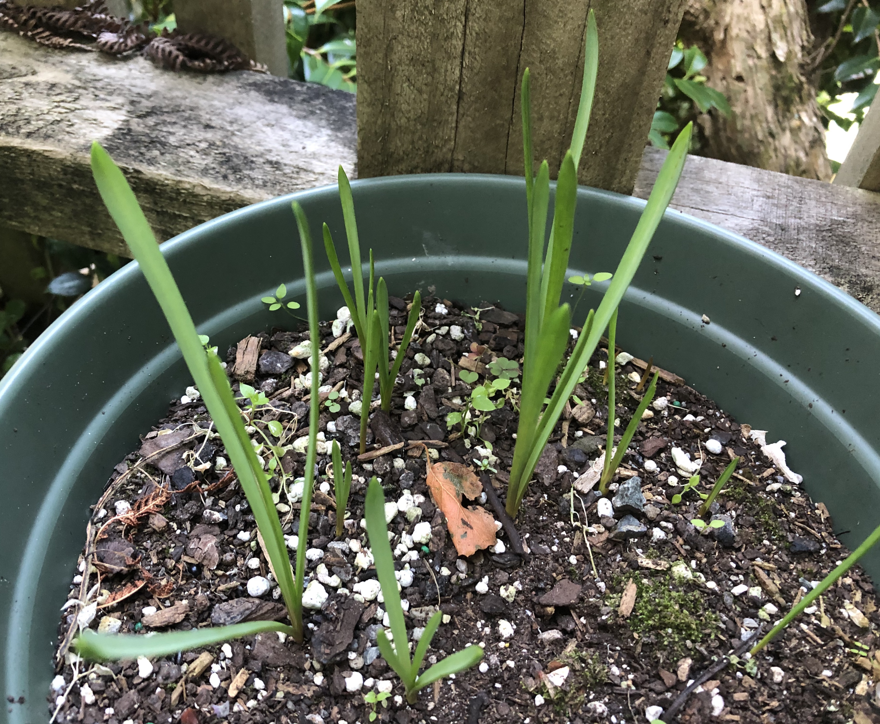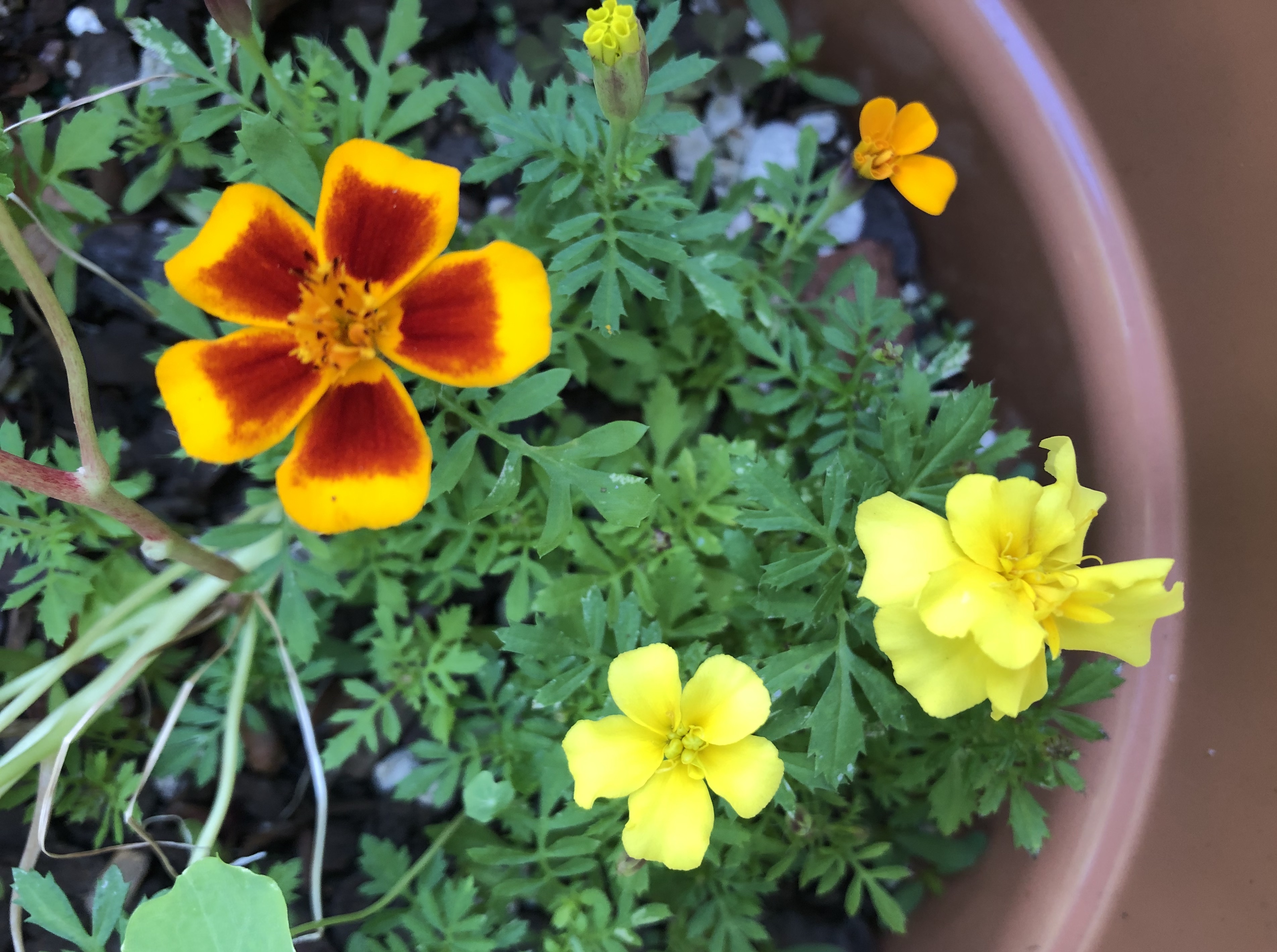 Now to surprises…I can see that the saffron crocuses are coming up again (will I get flowers this year?), but what are these? It is autumn. Then there are these marigolds. I found a packet of out of date seeds a while back and just emptied them out with no hope of much success but there are a few little flowers on plants that I should have thinned out, but the pot is in an out of the way place and had been ignored a bit.