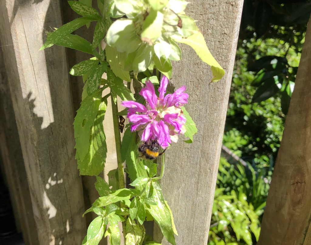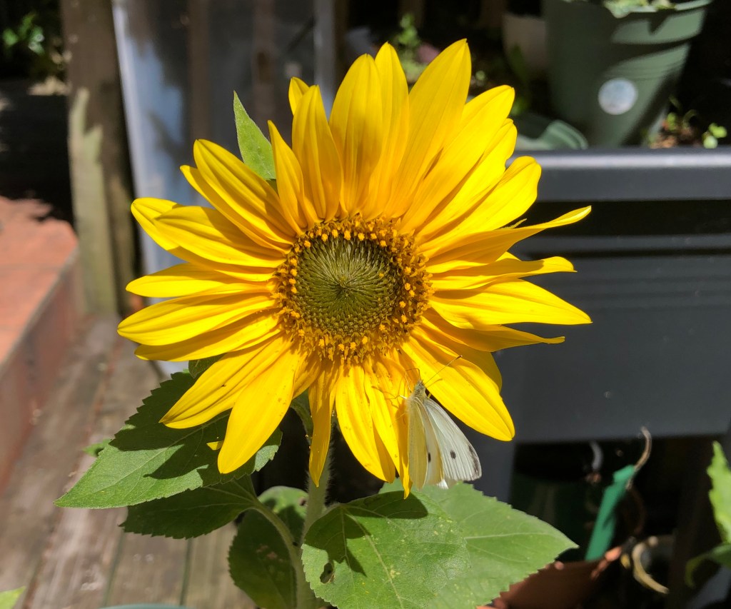 Finally, some insect visitors. What I have now correctly identified as a katydid on one of the sunflowers, a bee enjoying the lemon bergamot and a cabbage white butterfly on a sunflower.