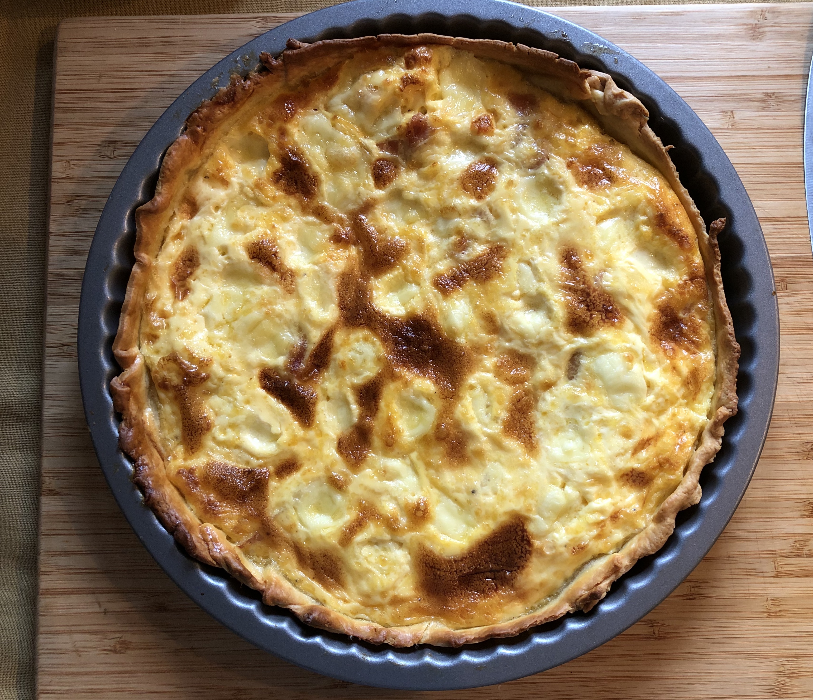 I quite often make a quiche in the summer, using frozen pastry and fillings such as hot smoked salmon and courgettes or ham and cheese. It is a good way of using up things in the fridge and give leftovers (hence the use of mozzarella on Sunday….).