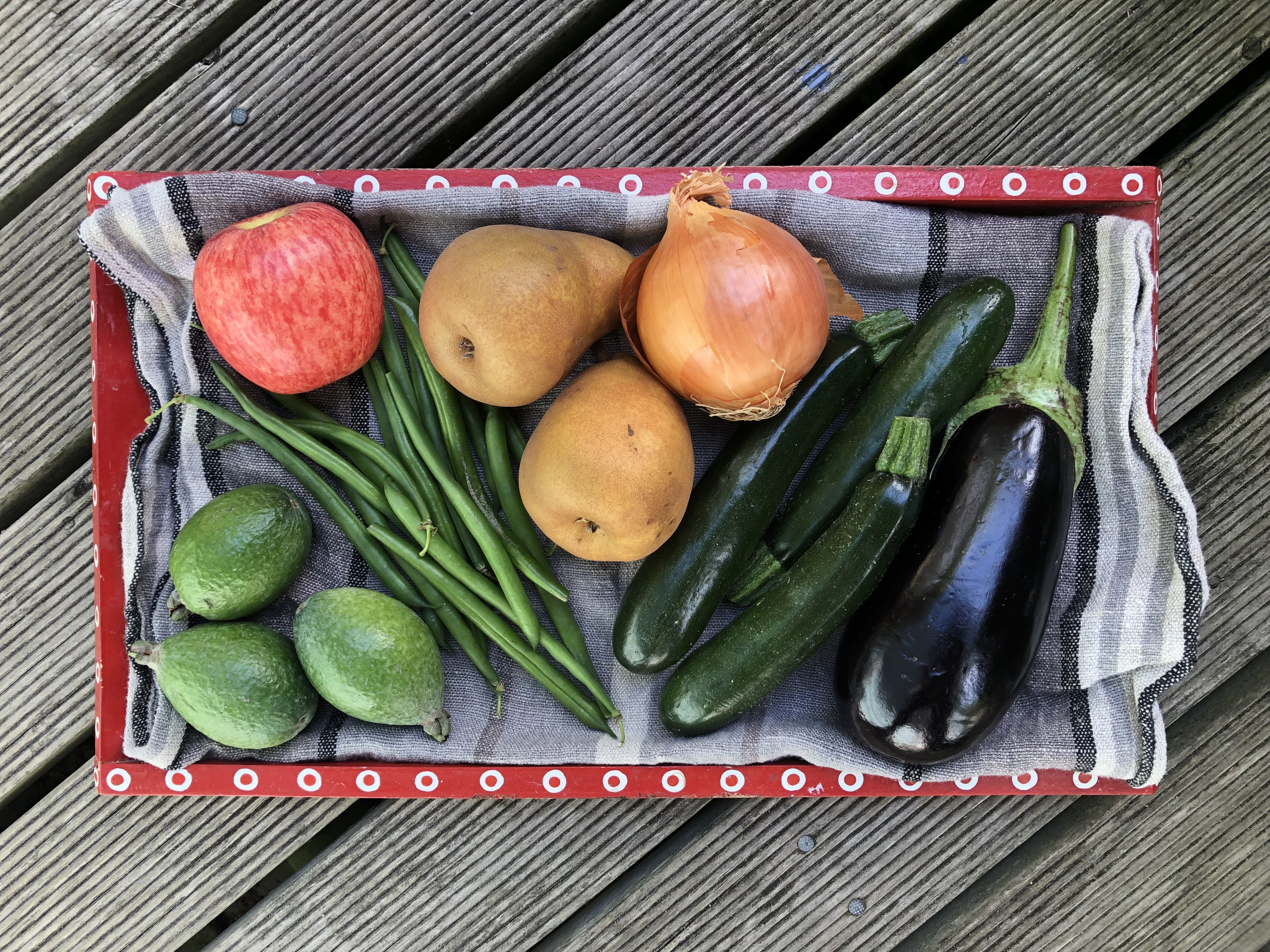 And so to food…in the basket this Saturday there were apples, pears and feijoas in keeping with the season. I might just make an apple and pear compote to have with thick Greek yoghurt as part of week-day breakfasts. There were green beans (served with Za’atar Salmon and Tahini from Ottolenghi Test Kitchen Shelf Love for Saturday’s dinner), courgettes, aubergines and essential onions. On Sunday we enjoyed croque monsieur over at Tartines French Cafe in Eastbourne after the exhibition and a salad of left over beans and tomatoes to have with a quiche topped with mozzarella for Sunday dinner.