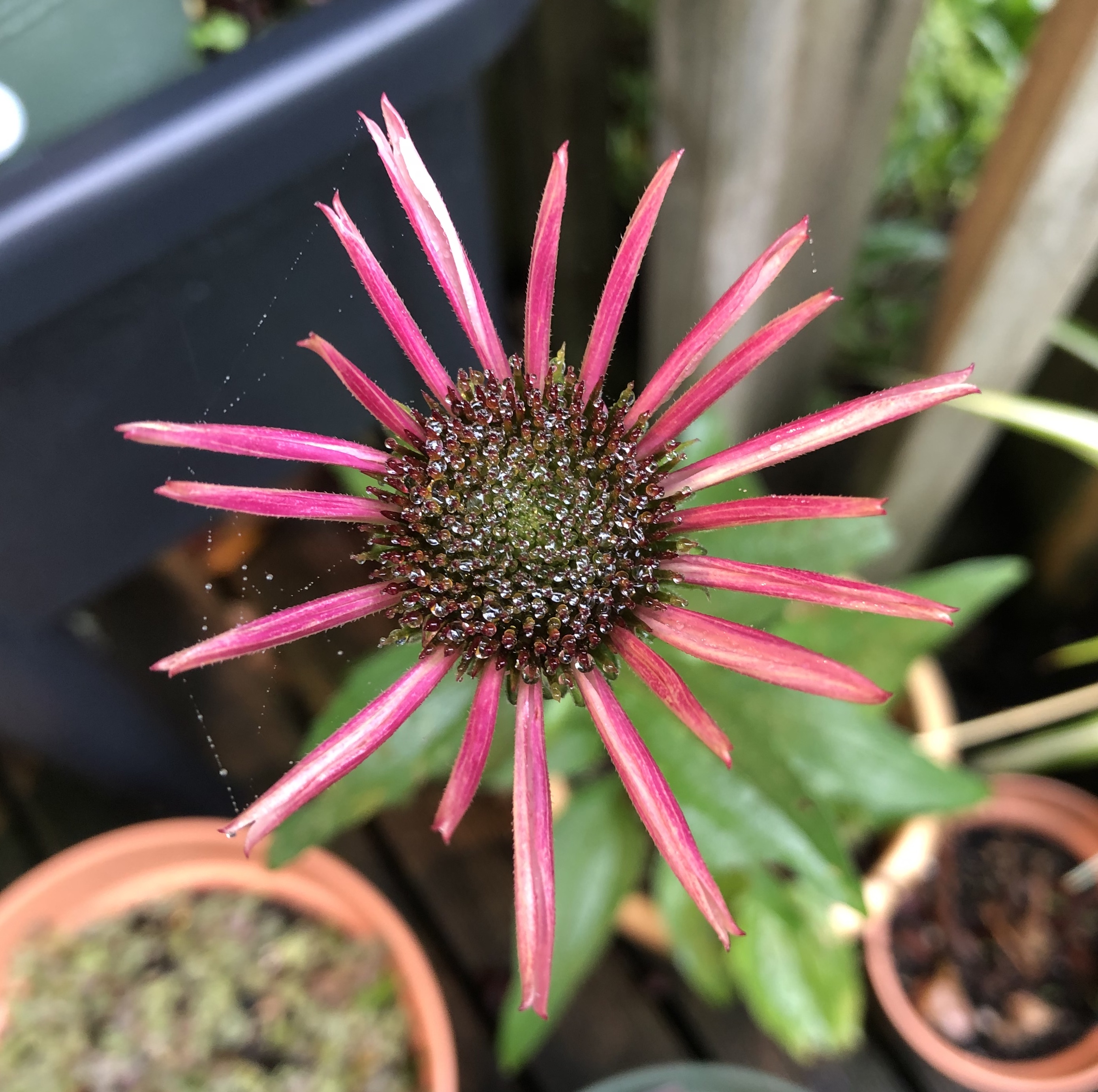 At number two, progress with the echinacea…on Wednesday it was covered with rain drops and a little spider’s web between the petals, today it looks like the picture below. Another joy in the garden.