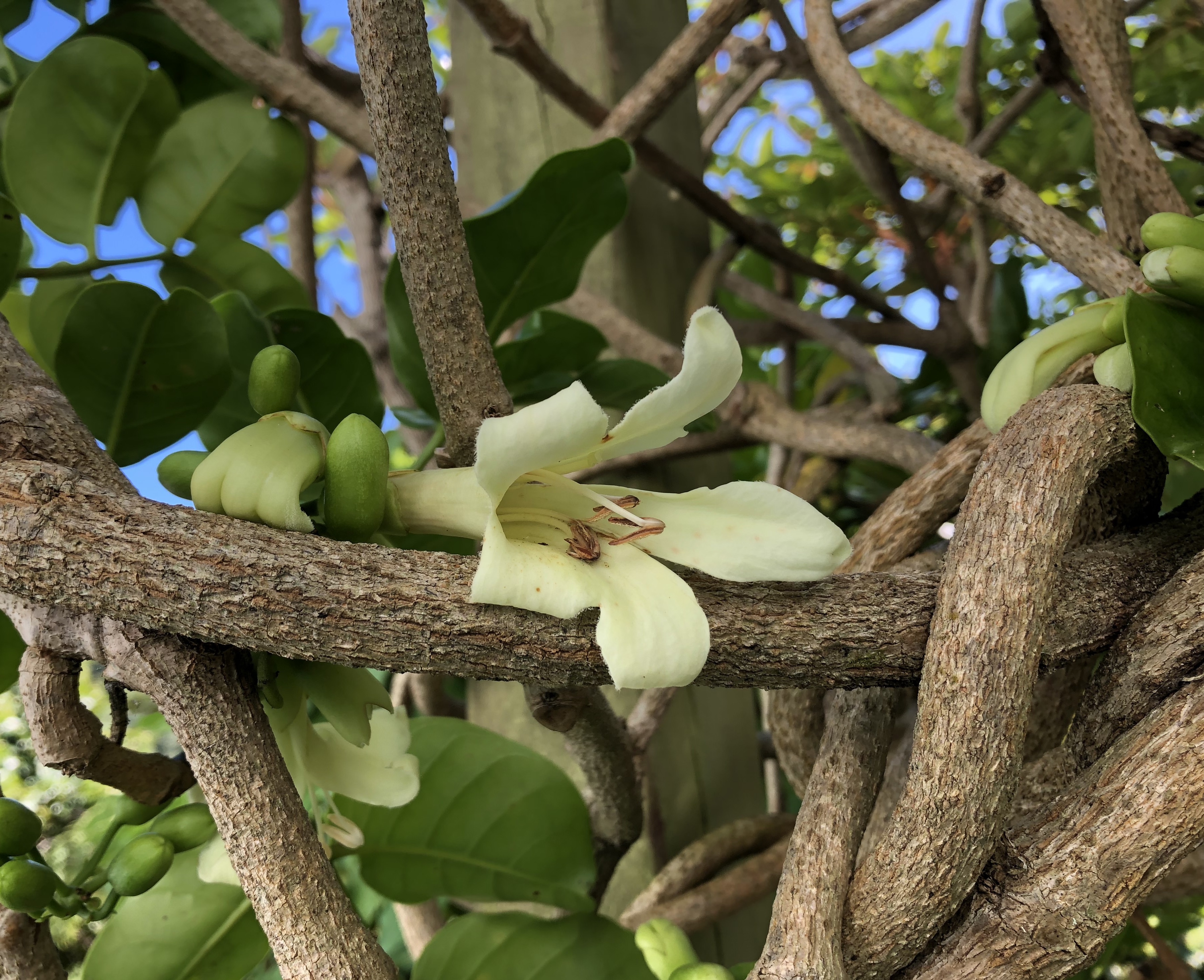 To end, the tecomanthe speciosa or Three Kings Vine which this year seems to be producing lots and lots of flowers. I managed to catch one bloom that had fallen off onto a leaf, and another one that looked like it was resting on a branch. There are lots more buds, and against the blue sky, they look wonderful. I checked out the plants in the Botanic Gardens, and we have far more flowers, but equally our plant gets a lot more sun. Every day I go out and look at it and smile.