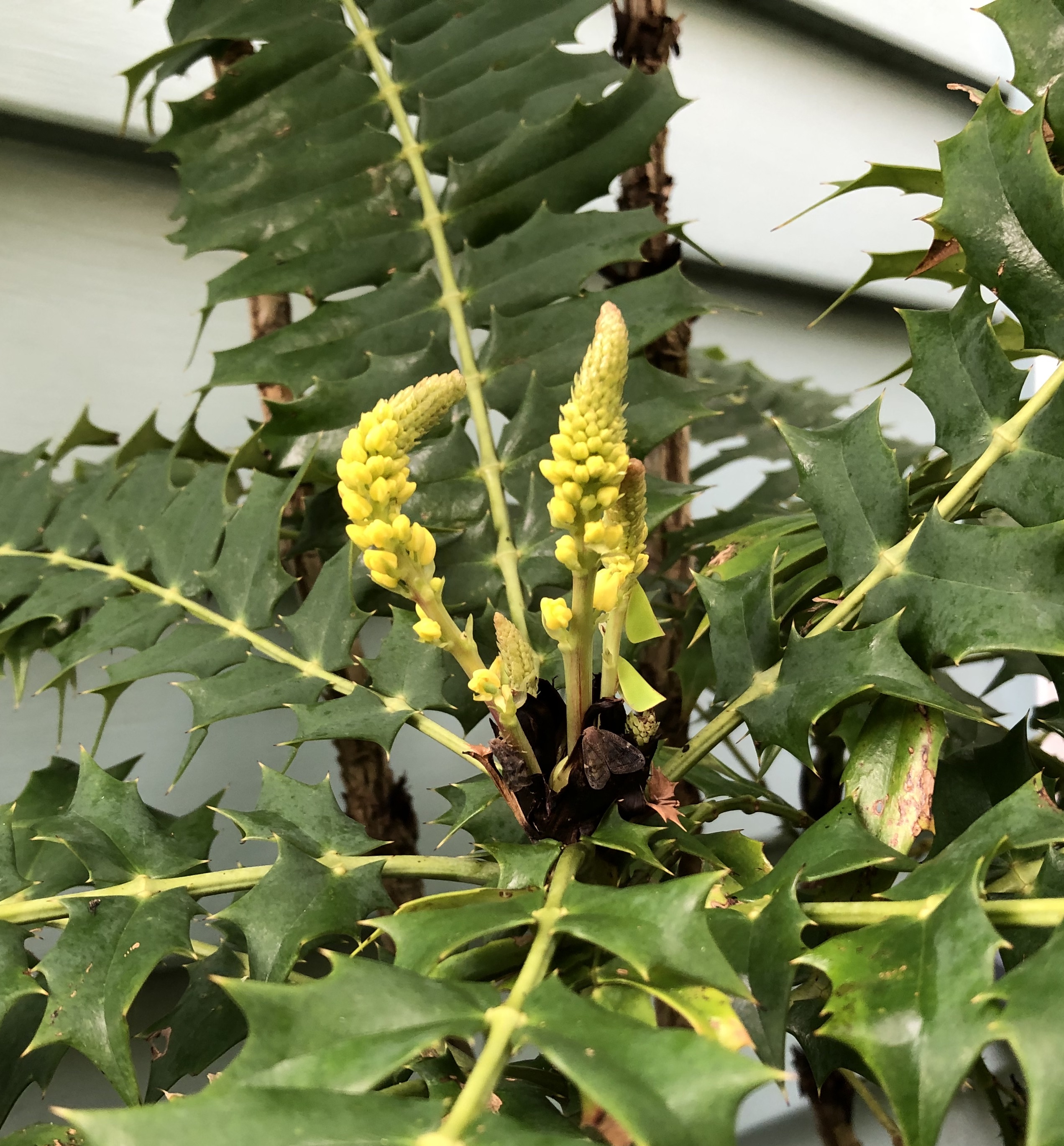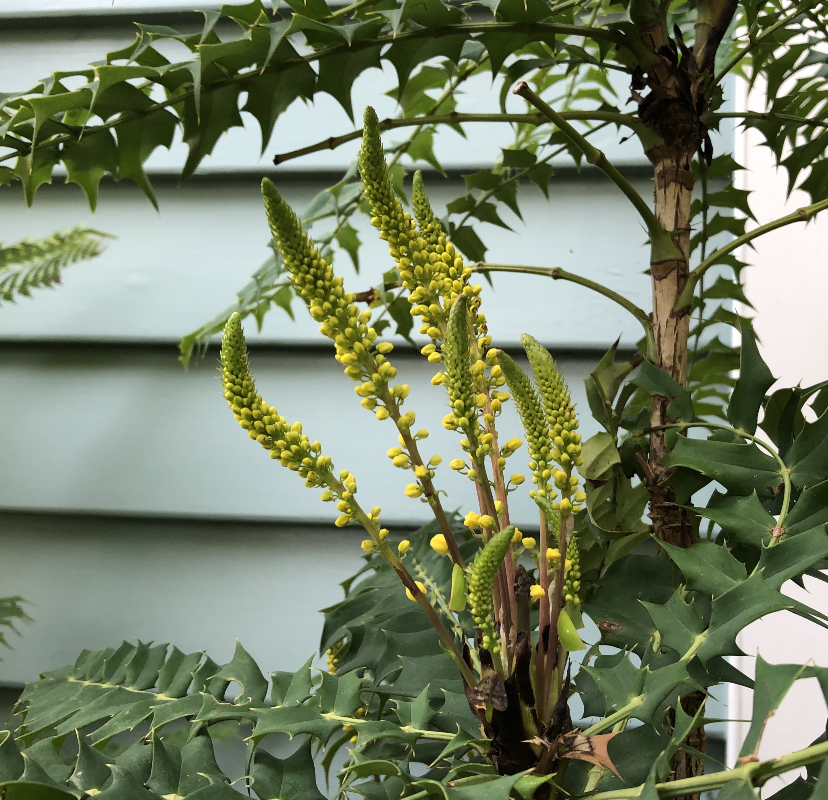 It’s mahonia time here again, with those yellow flowers that I happen to like – or at least in the situation they are in next to the house, where the bright pop of yellow replaces the gorgeous pink of the Japanese anemones which are in their last days.