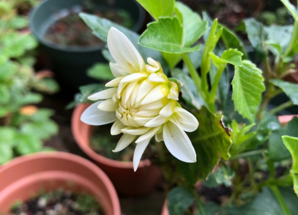 My dahlias started strongly this year, but after a period of hot weather followed by humid days, the plants developed powdery mildew which is quite common in these parts. I treated them all, cut them all back, and watched…and watched…and this week I saw this bud on one of the plants. Fingers crossed it opens.