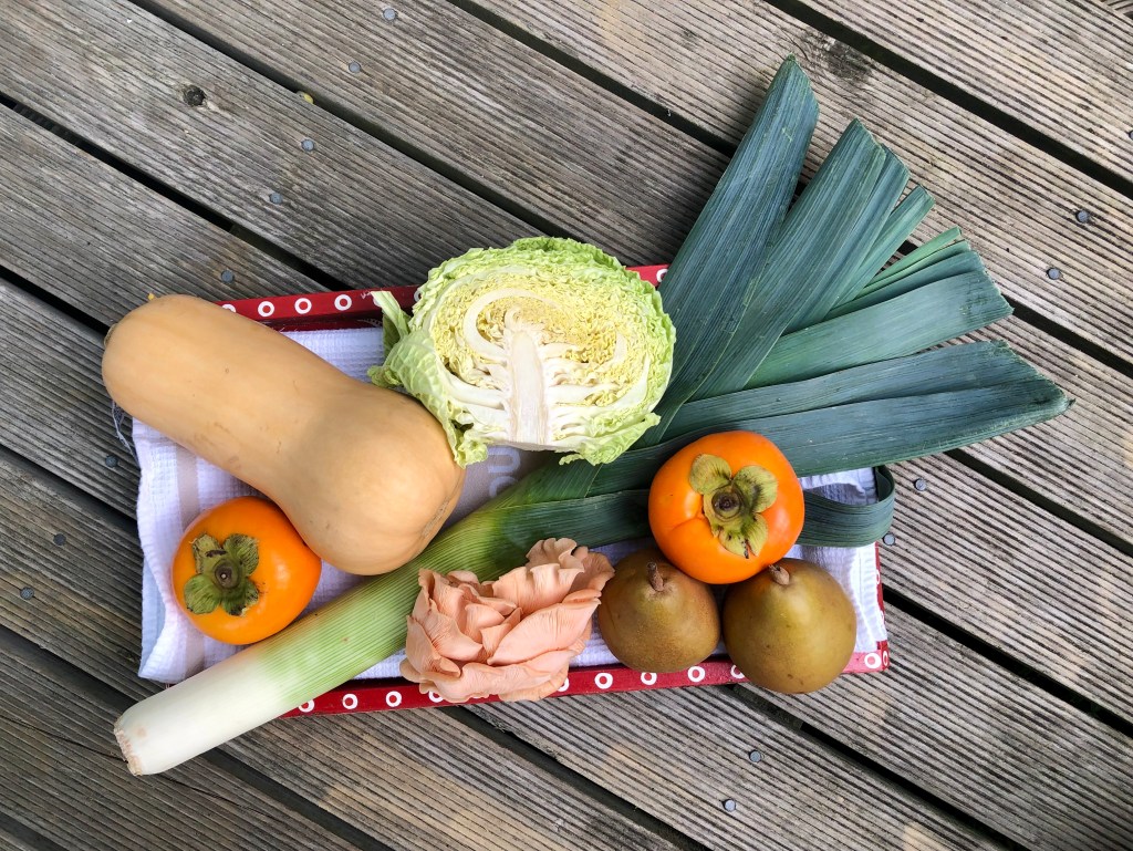In the shopping basket this week…a butternut squash for some midweek soup, another half cabbage, a leek, pears, persimmons and some oyster mushrooms which I used in a sauce with pork filet on Saturday evening.