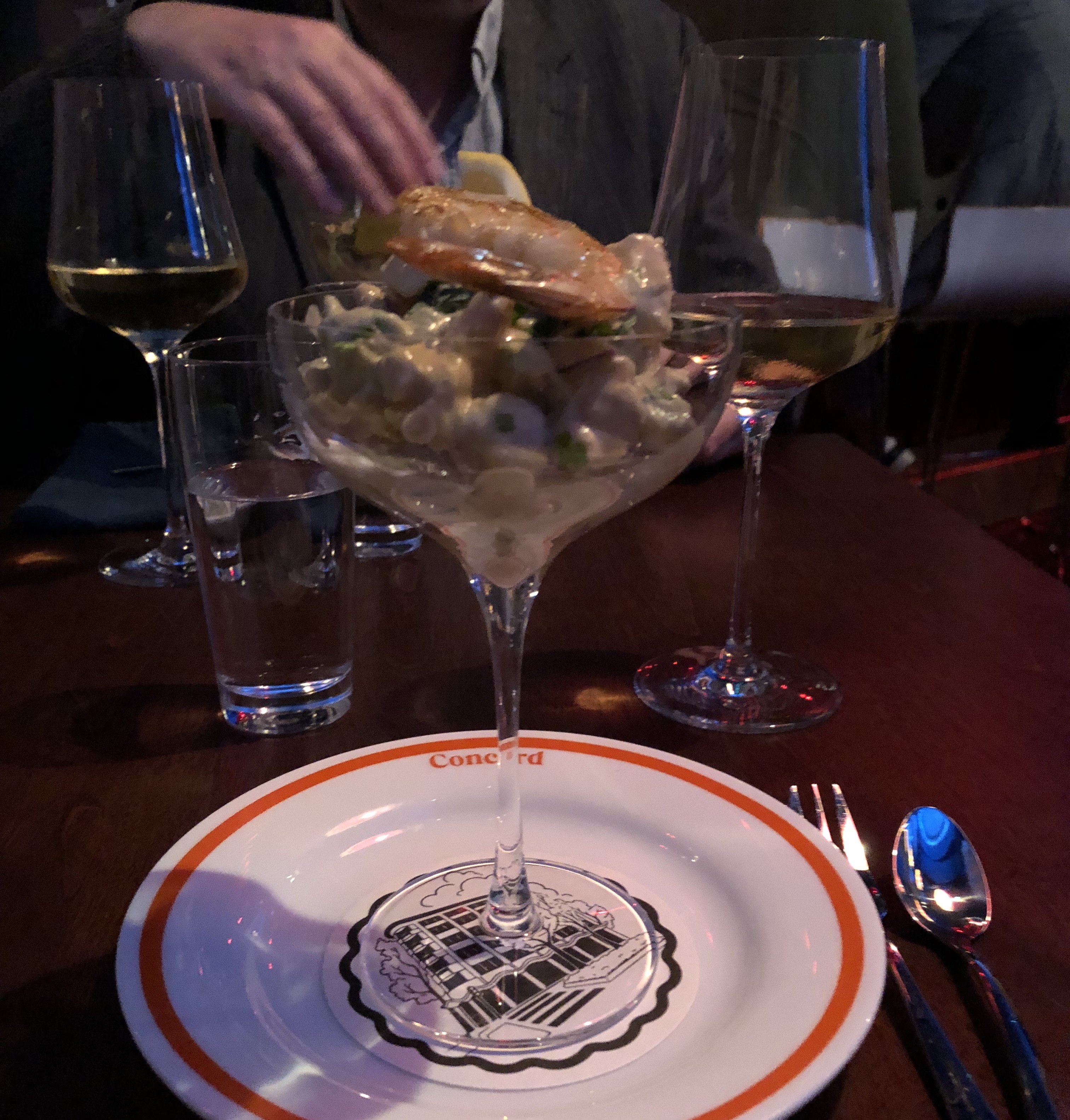 And so to food….on Thursday we had dinner at Concord. Housed in the former Wellington iconic cafe The Lido, it is owned by a couple of well known figures on the city’s hospitality scene. There is a retro feel to some of the items on the menu, and the decor too has a touch of the 1970s and 80s about it. We both opted for the shrimp cocktail to start, which came in the elegant glass below, and was complete with avocado, crisp red onion and a perfect Marie Rose sauce. The main event was a steak sandwich, full of flavour and perfectly cooked, and served with a suitable mound of chips (fries). Great food, wine and service means I can see us returning.