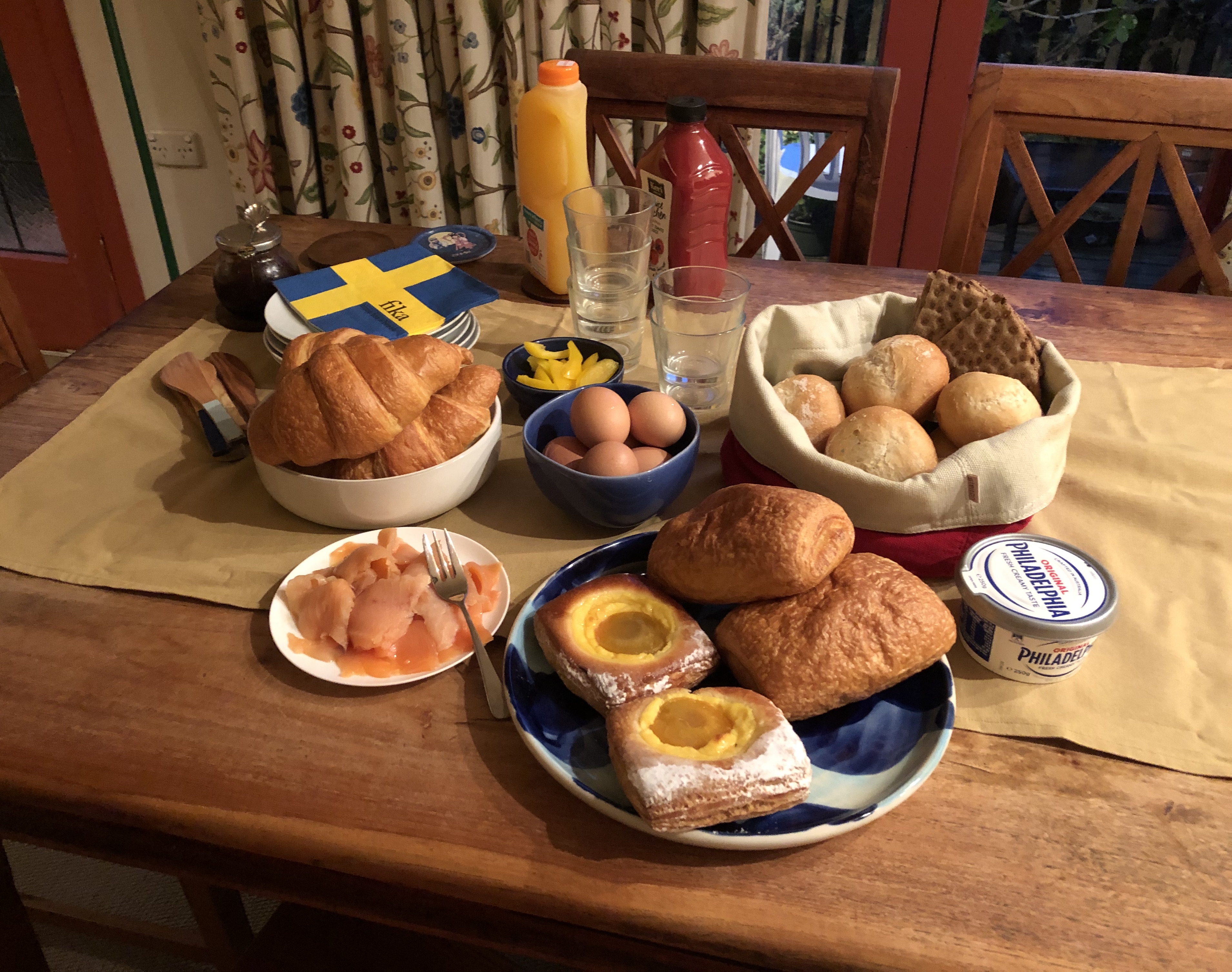 We were up early on Sunday to watch the final of the Eurovision Song Contest, and some friends came round to join us for breakfast and the competition. I ordered some croissants, pain au chocolat and apricot pastries, as well as some rolls from Arobake. Also on the table were hard boiled eggs, cream cheese, smoked salmon, capsicum, strawberry jam and orange and tomato juice. A really simple but tasty breakfast table, along with tea and coffee – and note the Swedish flag napkins!