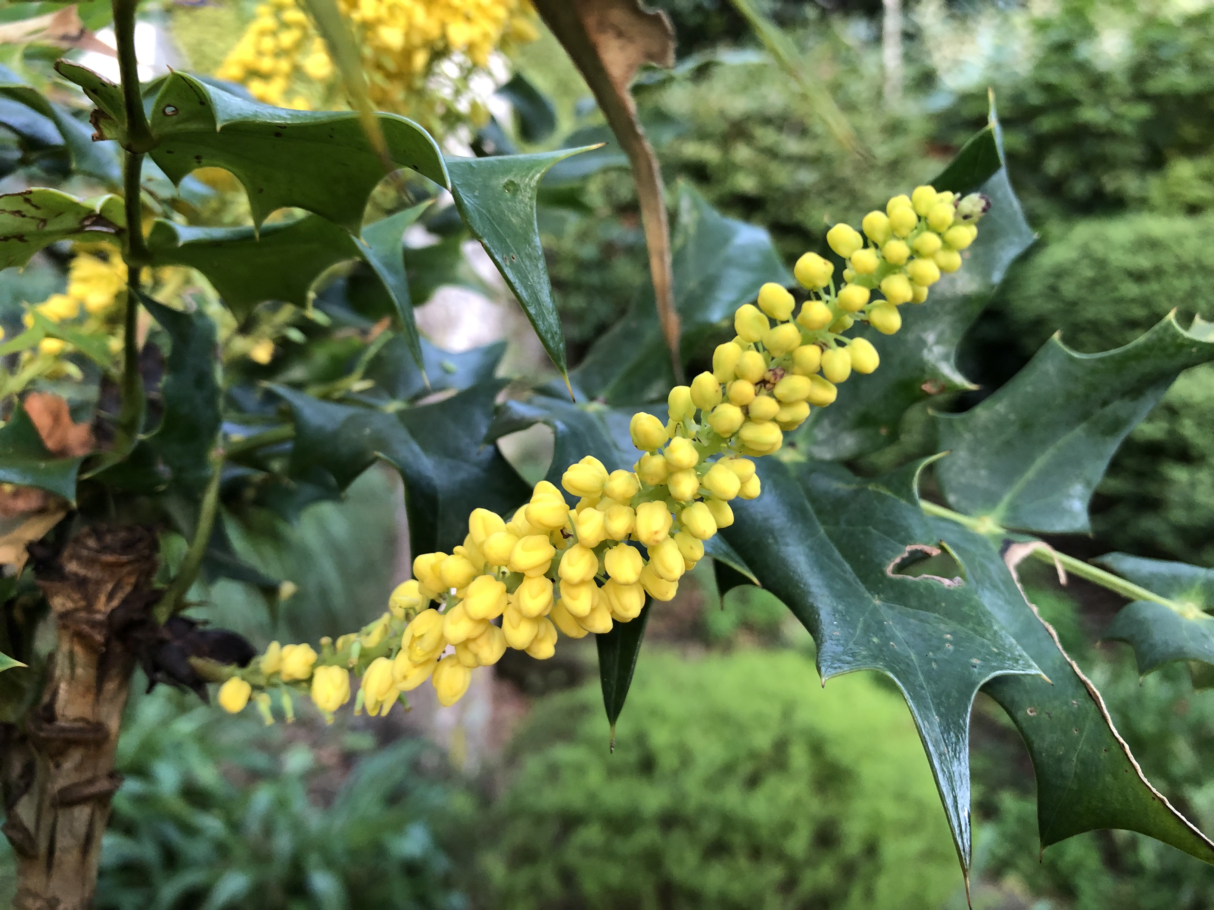At number two, the mahonia, with signs of the flowers turning to berries and a little visitor enjoying a feast on the last flowers.