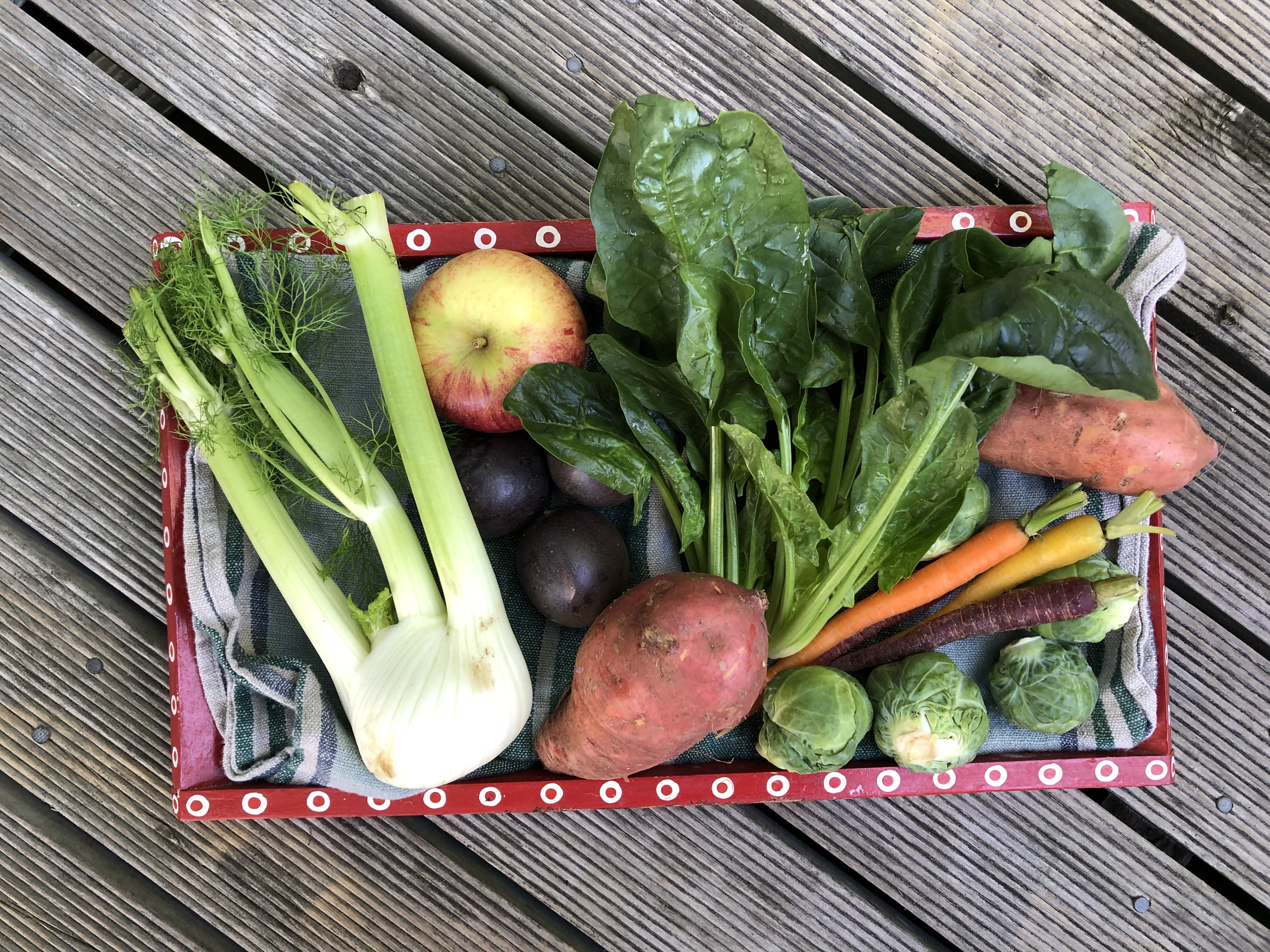 In the basket this week kumara (sweet potato) which went into a mash with potatoes on Saturday, some baby carrots of different hues which we had this evening, spinach and fennel for Tuesday’s dish, sprouts for Wednesday perhaps (though I also picked up a cauliflower and broccoli for NZ$5 for both of them), and some apples and passion fruit.